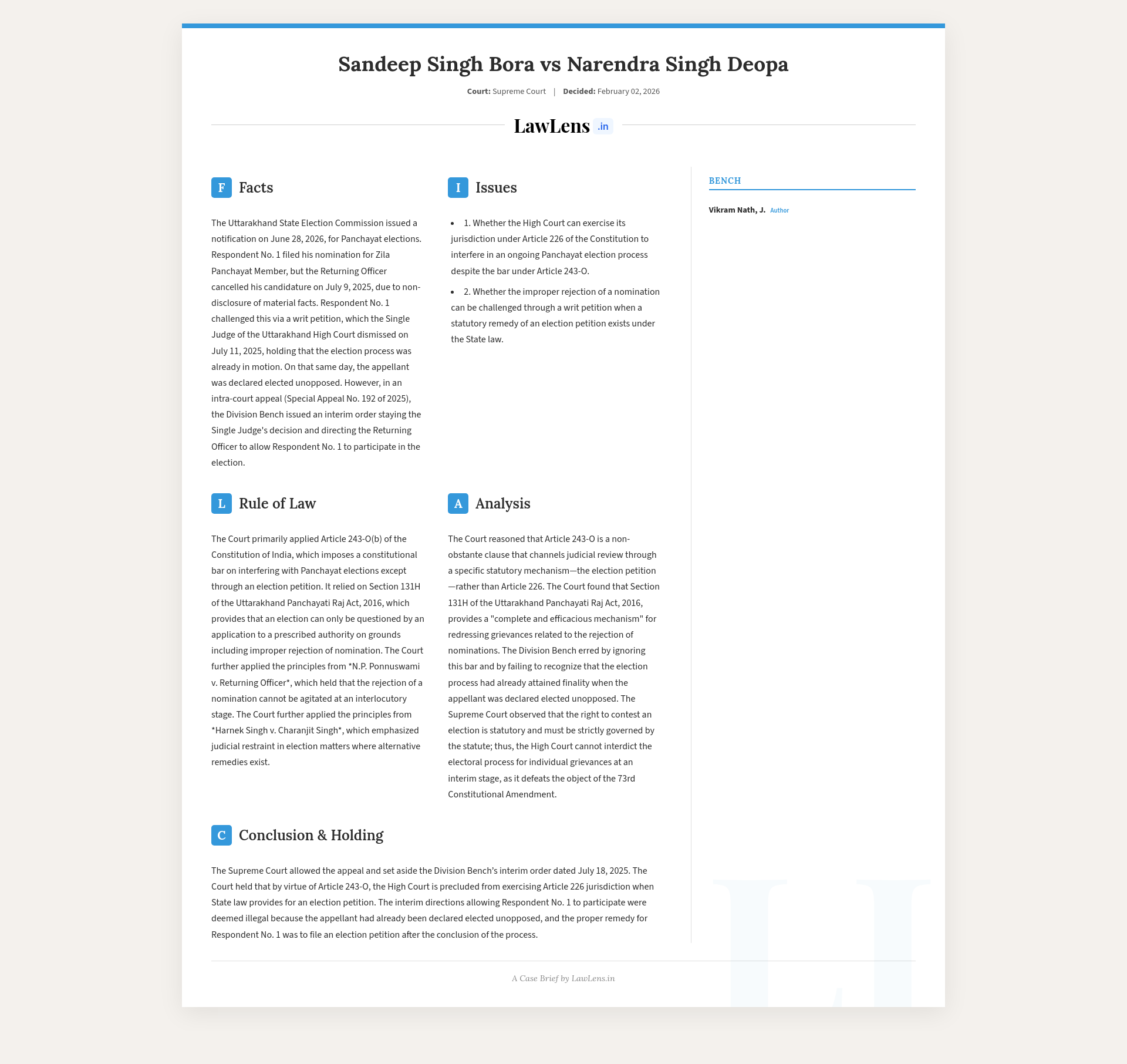 Brief 3‑sentence summary:The Supreme Court set aside an interim order of the Uttarakhand High Court which had stayed rejection of the respondent’s nomination and directed that he be allowed to contest the Zila Panchayat election after the appellant had already been declared elected unopposed. Relying on Article 243‑O of the Constitution and Section 131H of the Uttarakhand Panchayati Raj Act, the Court held that disputes about improper rejection of nominations in Panchayat elections must be pursued only through the statutory election‑petition mechanism, and that writ jurisdiction under Article 226 cannot ordinarily be used to interdict the electoral process. The Court emphasised that individual grievances must yield to the larger public interest in the smooth conduct of elections and dismissed the writ appeal, thereby upholding the appellant’s unopposed election.