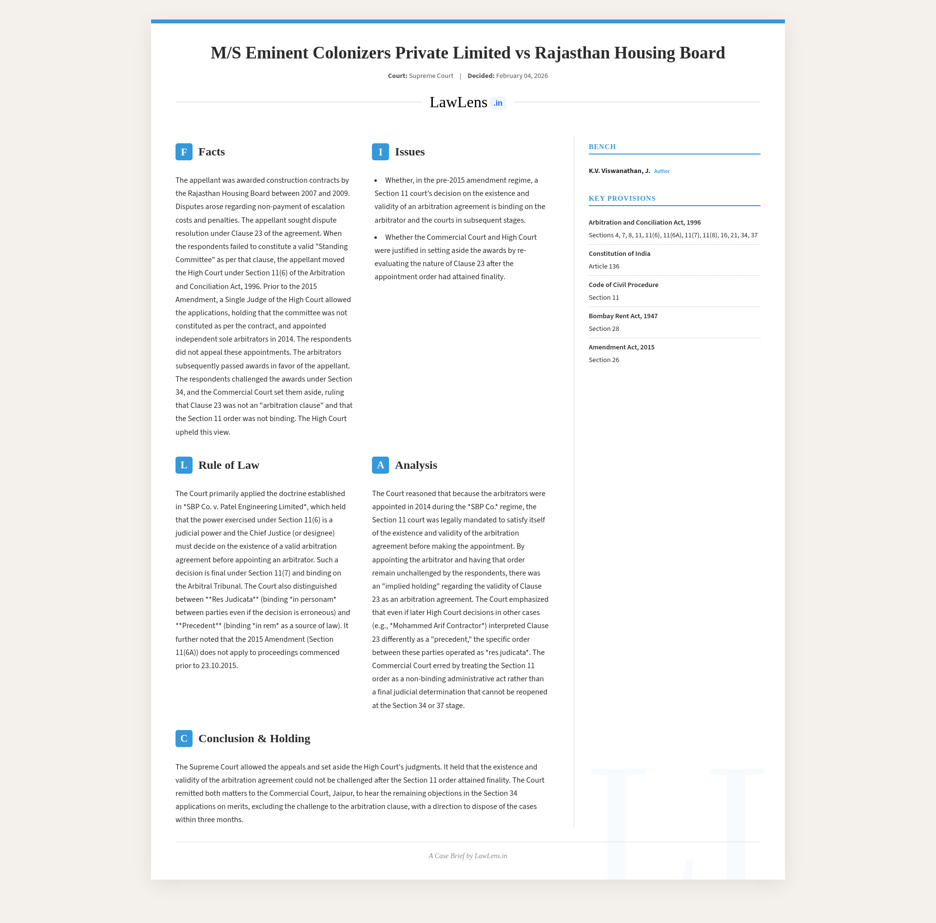 Case name and neutral citation:M/s Eminent Colonizers Private Limited v. Rajasthan Housing Board and Ors., 2026 INSC 116