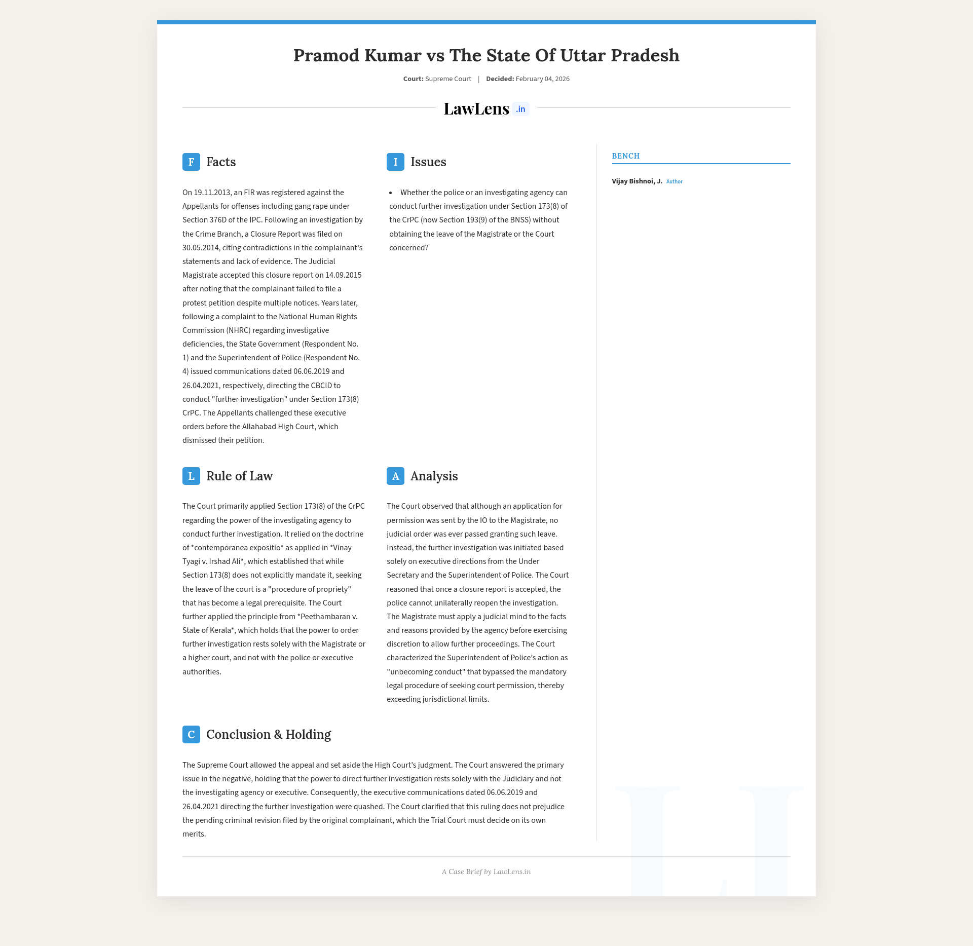 Pramod Kumar vs State of Uttar Pradesh 2026 INSC 120 - CrPC - Further Investigation - Magistrate Power