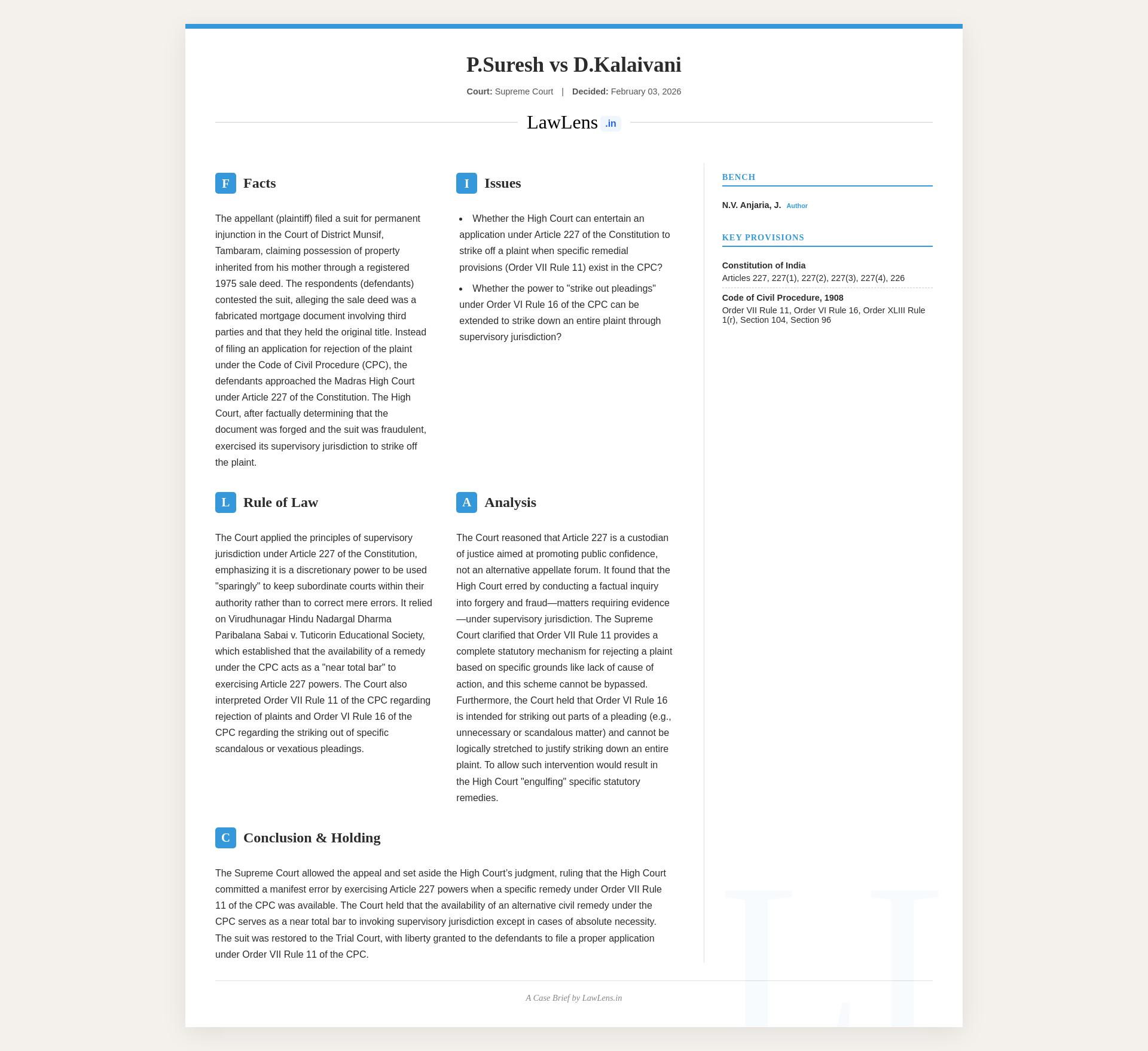 P. Suresh v. D. Kalaivani 2026 INSC 121 - Art.227 Constitution - CPC - Rejection Of Plaint - Striking Off Pleading