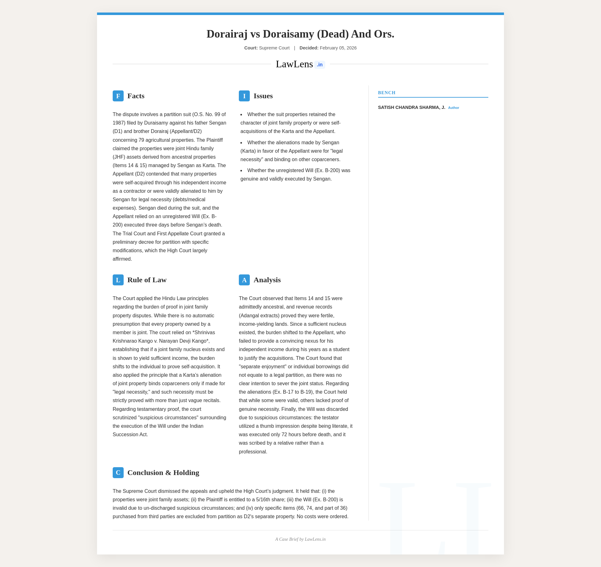The case concerns a long‑running partition dispute among members of a Hindu joint family over 79 items of mainly agricultural properties in Perambalur Taluk, with core issues about whether they were joint family assets, the validity of alienations by the karta (Sengan) in favour of one son (Dorairaj), and the effect of a disputed Will executed just before his death. The Supreme Court upheld the High Court’s finding that the suit properties were largely joint family properties, that only a few items purchased from third parties were the exclusive properties of Dorairaj, that several alienations by the karta were binding only where legal necessity was proved, and that the suspicious Will had rightly been rejected and had in any event attained finality. Consequently, the Court affirmed the plaintiff’s 5/16th share in the joint properties (subject to the specific exclusions already granted by the High Court) and dismissed the civil appeals without costs.