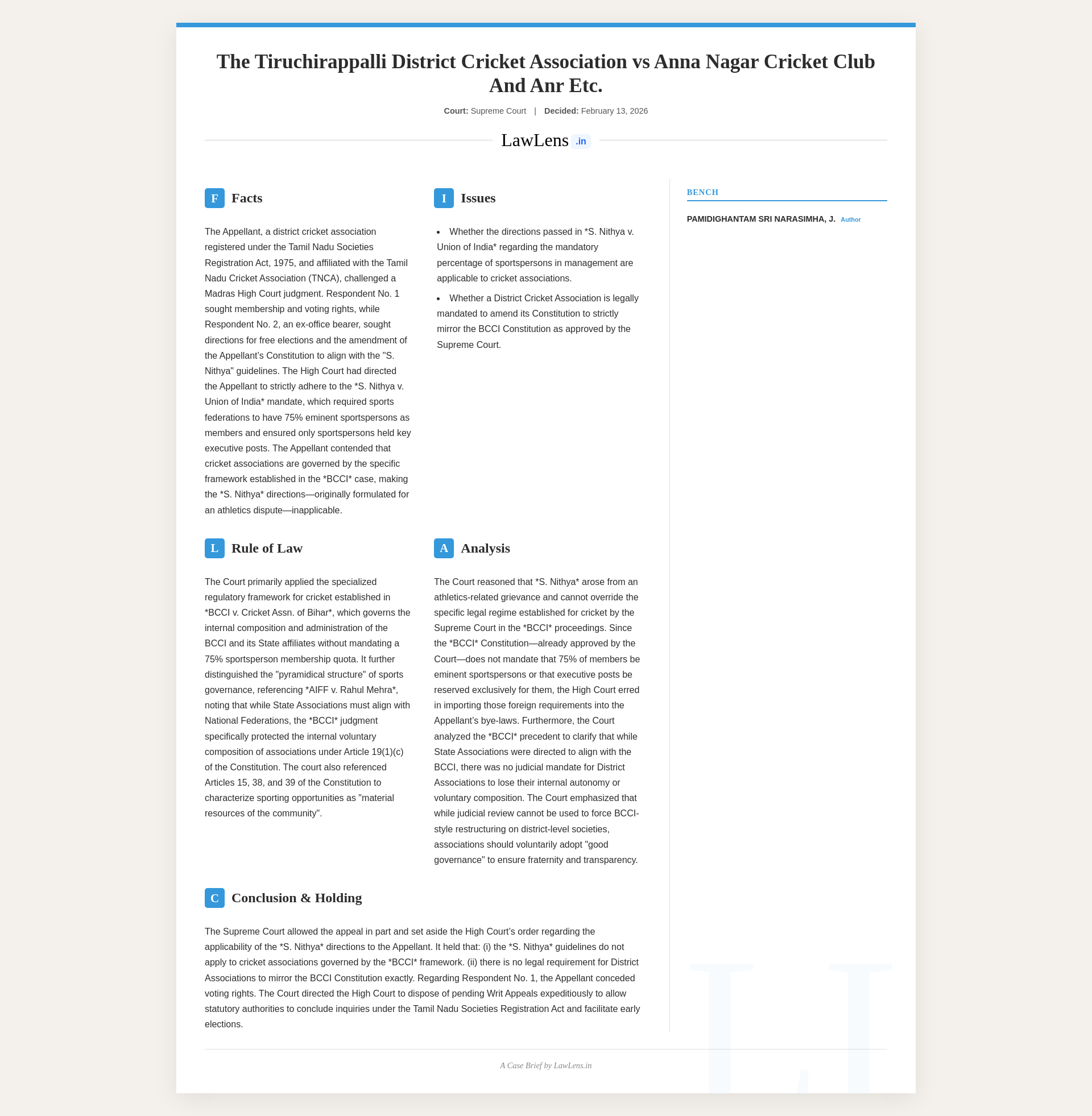 Brief three‑sentence summaryThe Supreme Court held that the Madras High Court’s directions in S. Nithya, including the requirement that 75% of sports‑body members be eminent sportspersons, are not applicable to cricket associations governed by the BCCI framework, and therefore cannot be imposed on the Tiruchirappalli District Cricket Association. The Court also rejected the contention that the district association is bound to model its constitution on the BCCI Constitution, while nonetheless emphasizing the need for transparency, good governance, and reform in district cricket administration. It set aside the High Court’s order to that limited extent, left membership and composition disputes to be decided expeditiously by the Madras High Court and statutory authorities, and recorded that the club’s voting rights and oversight of future elections could stand.