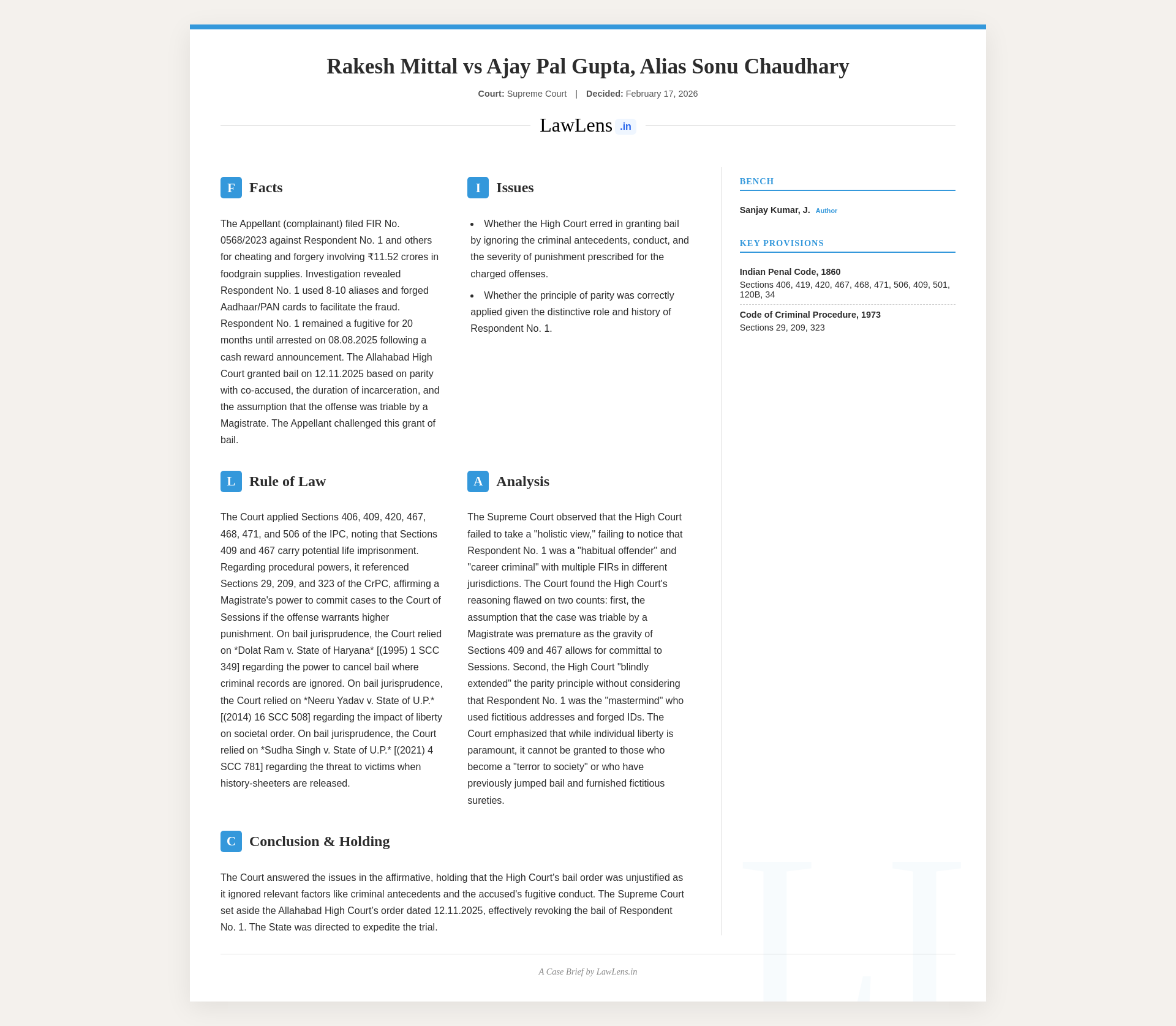 Case name and neutral citation:Rakesh Mittal v. Ajay Pal Gupta @ Sonu Chaudhary and another, 2026 INSC 161