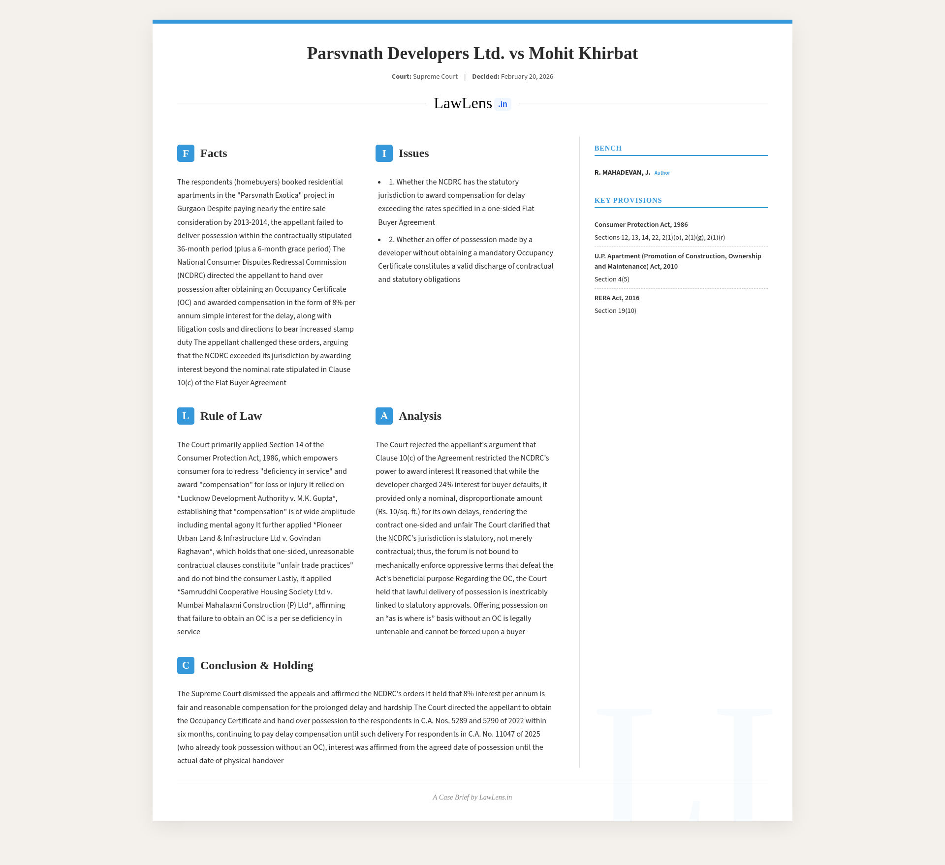 Parsvnath Developers Ltd. v. Mohit Khirbat 2026 INSC 170 - Consumer Protection - Flat Purchase - Delay In Handing Over Possession