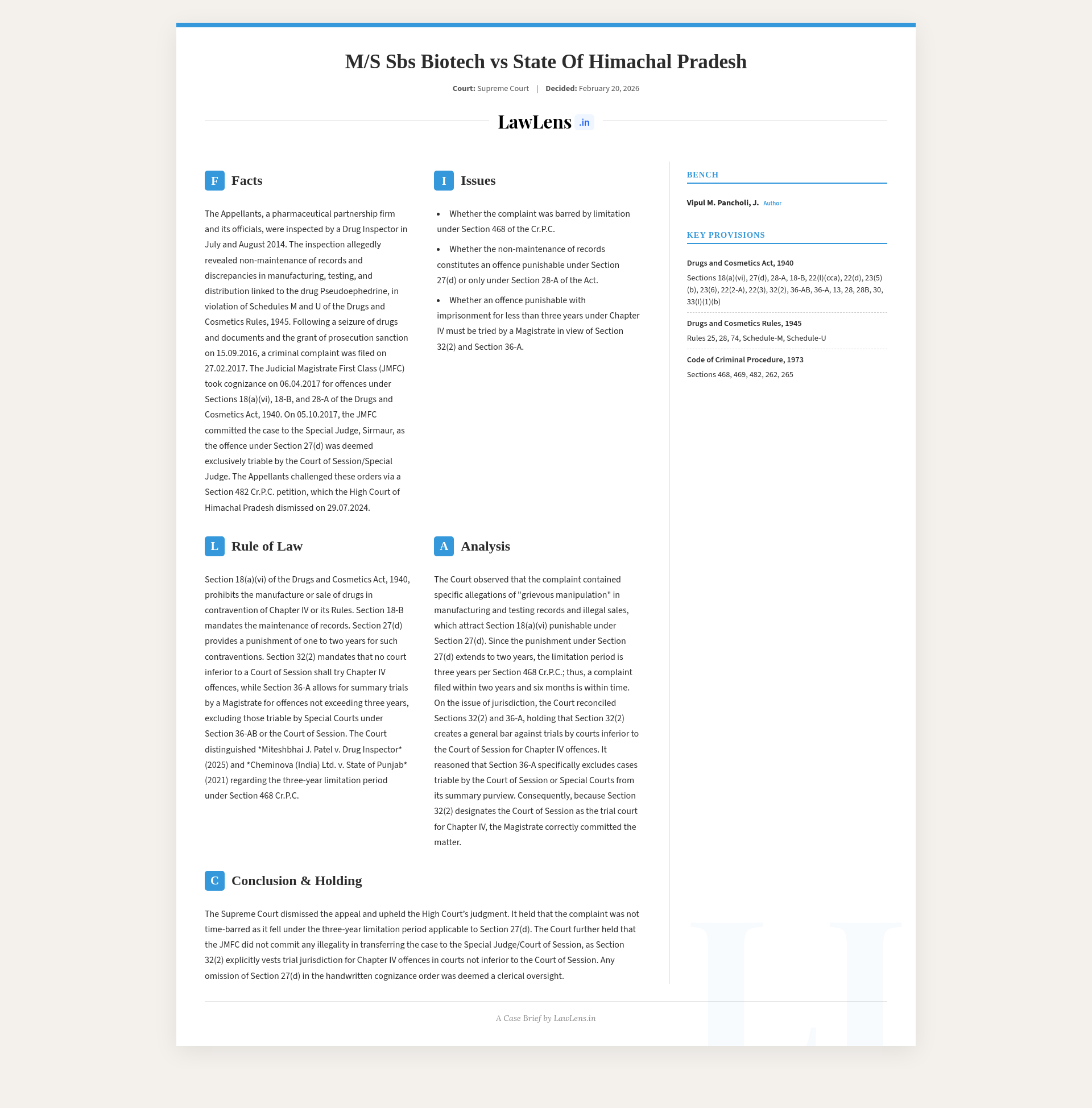 Brief three‑sentence summary:The Supreme Court upheld the criminal prosecution of M/s SBS Biotech and its officers for alleged violations of the Drugs and Cosmetics Act relating to non‑maintenance and manipulation of manufacturing and consumption records for pseudoephedrine, treating the conduct as a contravention of Section 18(a)(vi) punishable under Section 27(d), in addition to Section 18‑B/28‑A. It held that the omission of Section 27(d) in the body of the cognizance order was merely clerical since the complaint, title, and committal order all clearly invoked Section 27(d), and therefore the limitation period was three years under Section 468 CrPC, within which the complaint was filed. The Court further ruled that, in view of Section 32(2) read with Sections 36‑A and 36‑AB of the Act, offences under Chapter IV are triable by the Court of Session/Special Court and the Magistrate correctly committed the case, leading to dismissal of the quashing petition.