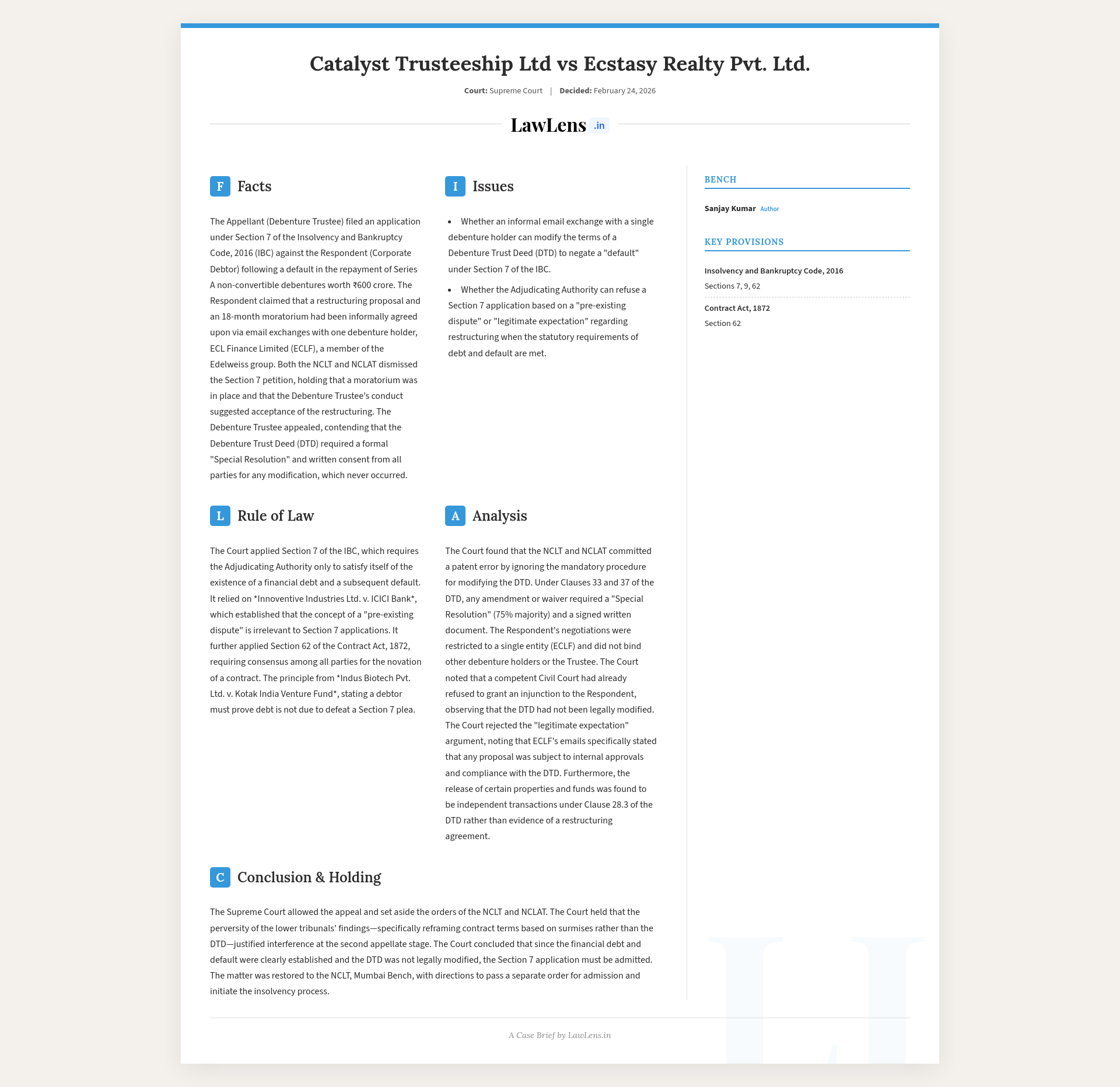 The Supreme Court held that the National Company Law Tribunal and the NCLAT had perversely refused admission of a Section 7 IBC application by Catalyst Trusteeship Ltd. against Ecstasy Realty Pvt. Ltd. by wrongly assuming that a restructuring with an 18‑month moratorium was in place. The Court found that any loan restructuring or waiver required compliance with the Debenture Trust Deed—written consent of debenture holders through the prescribed procedure and a written amendment—which admittedly never occurred, and that emails exchanged only with one debenture holder (ECL Finance) could not bind other debenture holders or the debenture trustee. Setting aside the NCLT and NCLAT orders, the Supreme Court directed that the Section 7 petition be admitted and CIRP steps proceed in accordance with law.