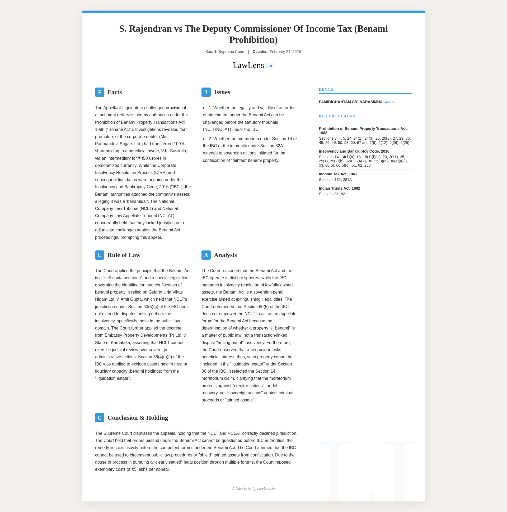 Three‑sentence brief summary:The Supreme Court held that orders of provisional attachment and adjudication passed under the Prohibition of Benami Property Transactions Act, 1988 cannot be challenged before the NCLT/NCLAT in proceedings under the Insolvency and Bankruptcy Code, 2016, and must instead be assailed only before the forums constituted under the Benami Act. It ruled that benami proceedings are sovereign, in rem, penal actions in the public law domain, that benami property is not beneficially owned by the corporate debtor and therefore does not form part of the liquidation estate under Section 36 IBC, and that Section 14 moratorium and Section 32A IBC neither override nor cure tainted title. Finding the liquidators’ recourse to IBC fora an abuse of process intended to bypass the Benami Act mechanism, the Court dismissed all the appeals with exemplary costs of Rs. 5 lakhs each, payable to SCAORA.