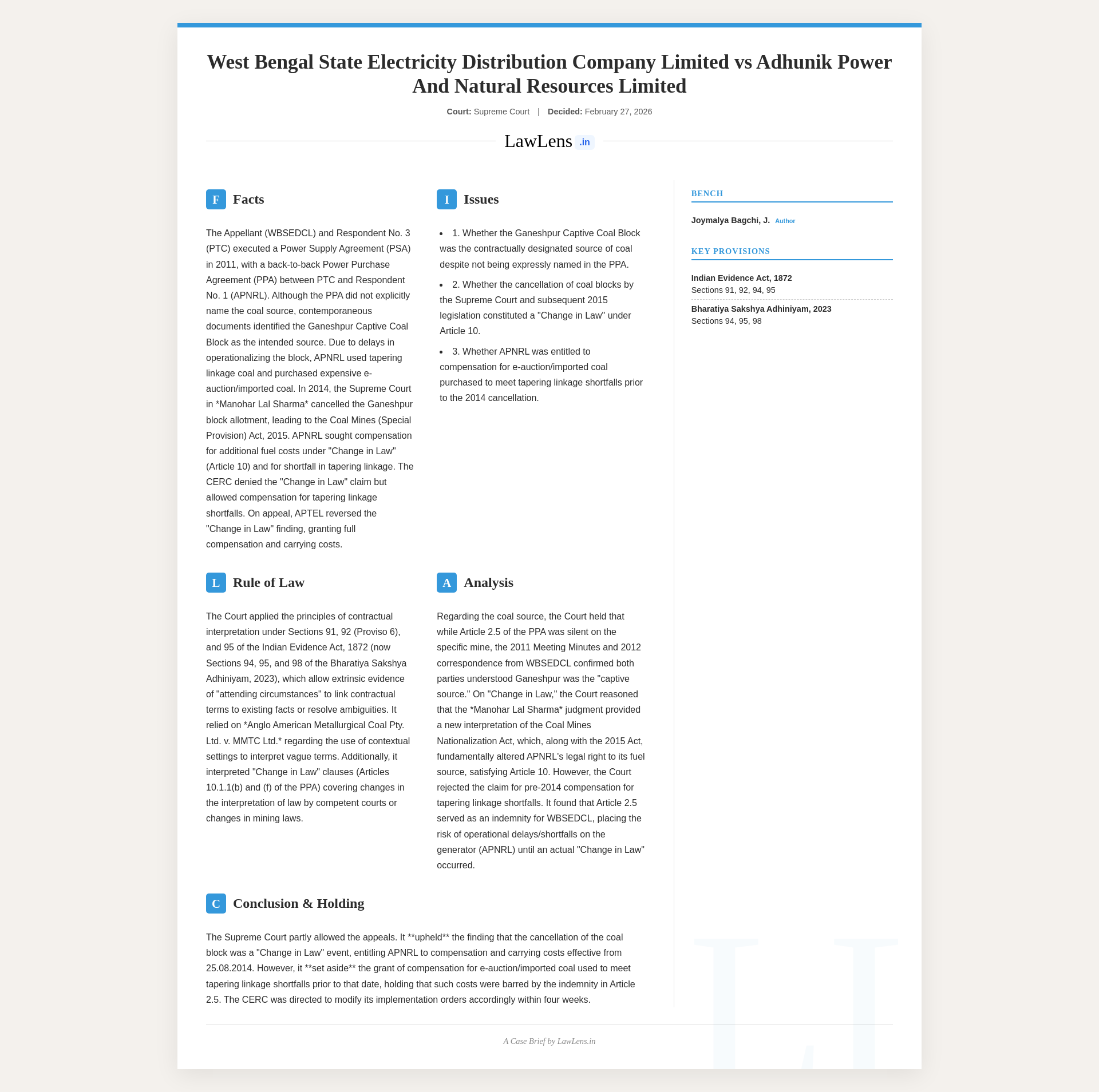 West Bengal State Electricity Distribution Co. Ltd. v. Adhunik Power & Natural Resource Ltd. 2026 INSC 202 - Contract Law