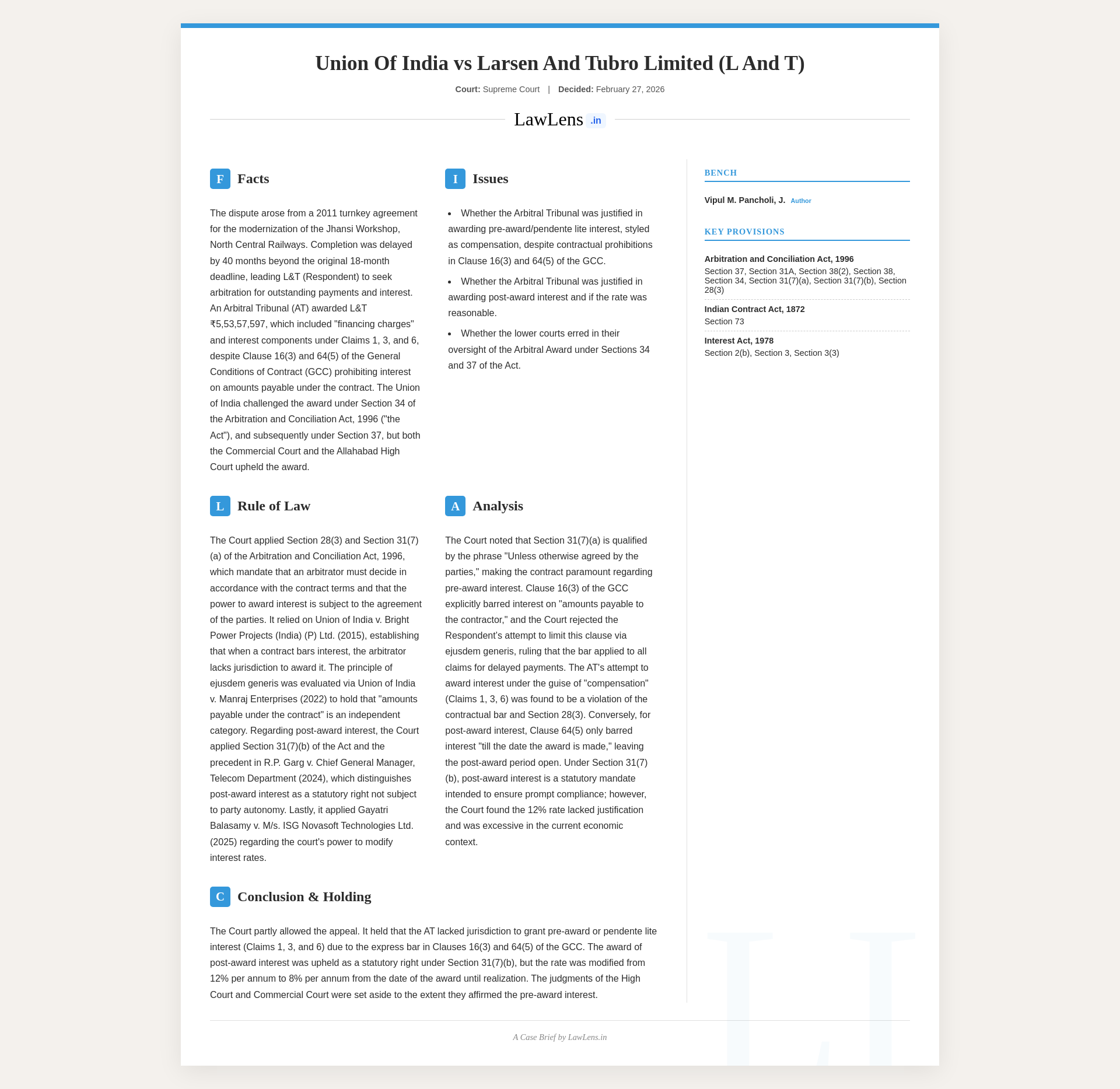 Union of India & Ors. v. Larsen & Toubro Limited (L&T) 2026 INSC 203 - S.31 Arbitration Act - Post/Pre Award Interest