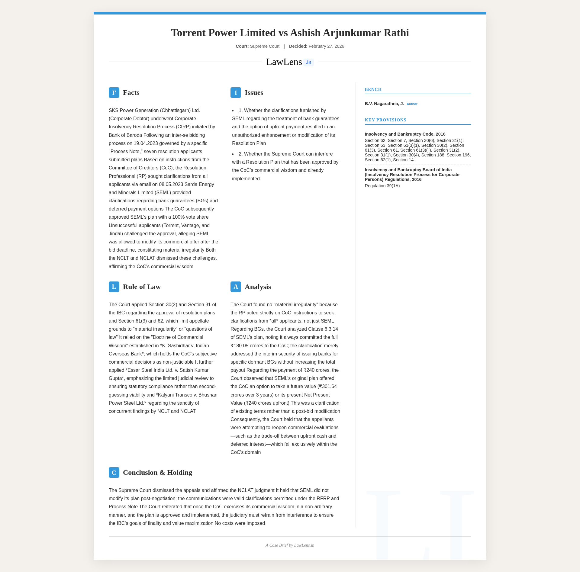 The Supreme Court dismissed appeals by unsuccessful resolution applicants (Torrent, Vantage, Jindal) challenging approval of Sarda Energy and Minerals Ltd.’s resolution plan for SKS Power Generation (Chhattisgarh) Ltd., holding that their grievances did not fit any ground under Section 61(3) IBC and raised no question of law under Section 62. The Court found that the so‑called “post‑bid” clarifications on bank guarantees and the Rs. 240 crore deferred/upfront component did not modify or enhance SEML’s offer, that the Resolution Professional had only acted on the Committee of Creditors’ instructions, and that there was no “material irregularity.” Emphasising the primacy of the CoC’s commercial wisdom, the concurrent findings of NCLT and NCLAT, and the need for speed, predictability and finality in the IBC regime, the Court affirmed the NCLAT judgment and cautioned against strategic litigation by unsuccessful bidders seeking to re‑open commercial decisions through courts.