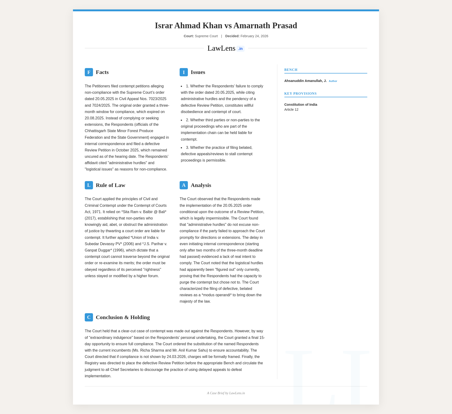 Israr Ahmad Khan v. Amarnath Prasad 2026 INSC 209 - Contempt - Third Parties - Belated Filing Of Appeals