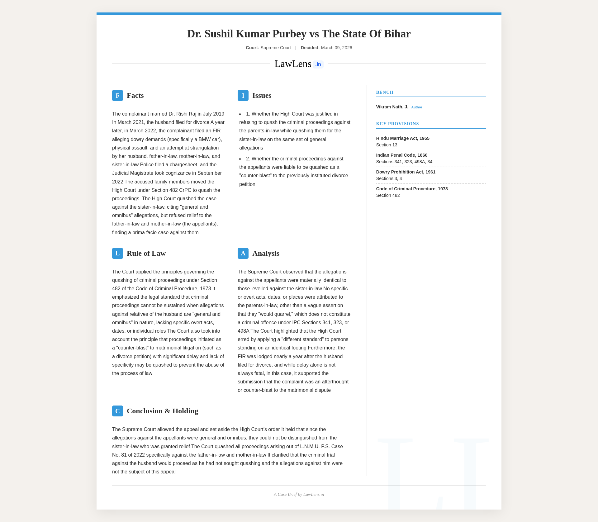 Sushil Kumar Purbey v. State of Bihar 2026 INSC 212 - S.498A IPC - Dowry Prohibition Act -Parents-In-Law