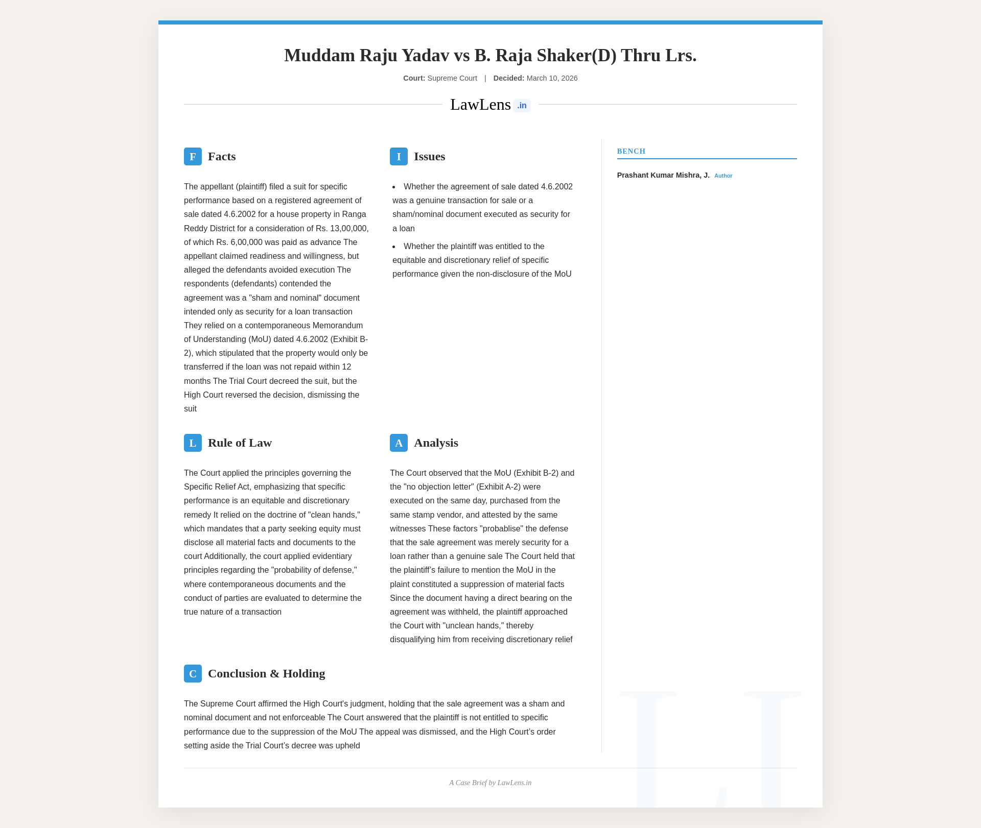 Muddam Raju Yadav v. B. Raja Shanker (D) 2026 INSC 214- Specific Relief Act - Specific Performance Suit - Conduct Of Parties