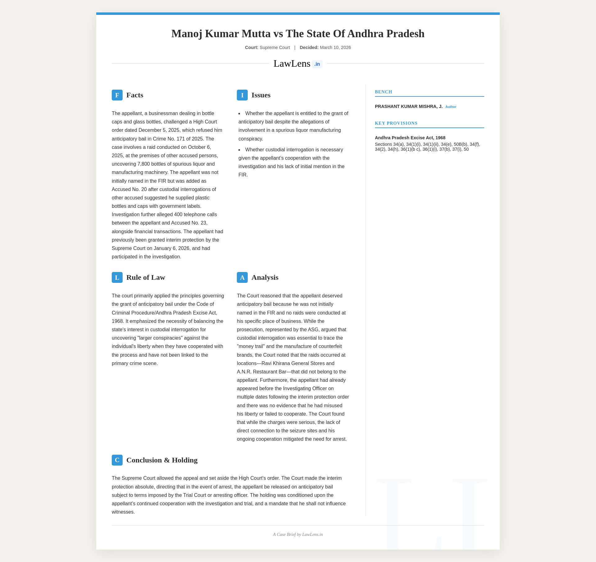 Manoj Kumar Mutta v. State of Andhra Pradesh 2026 INSC 215 - Anticipatory Bail - Andhra Pradesh Excise Act