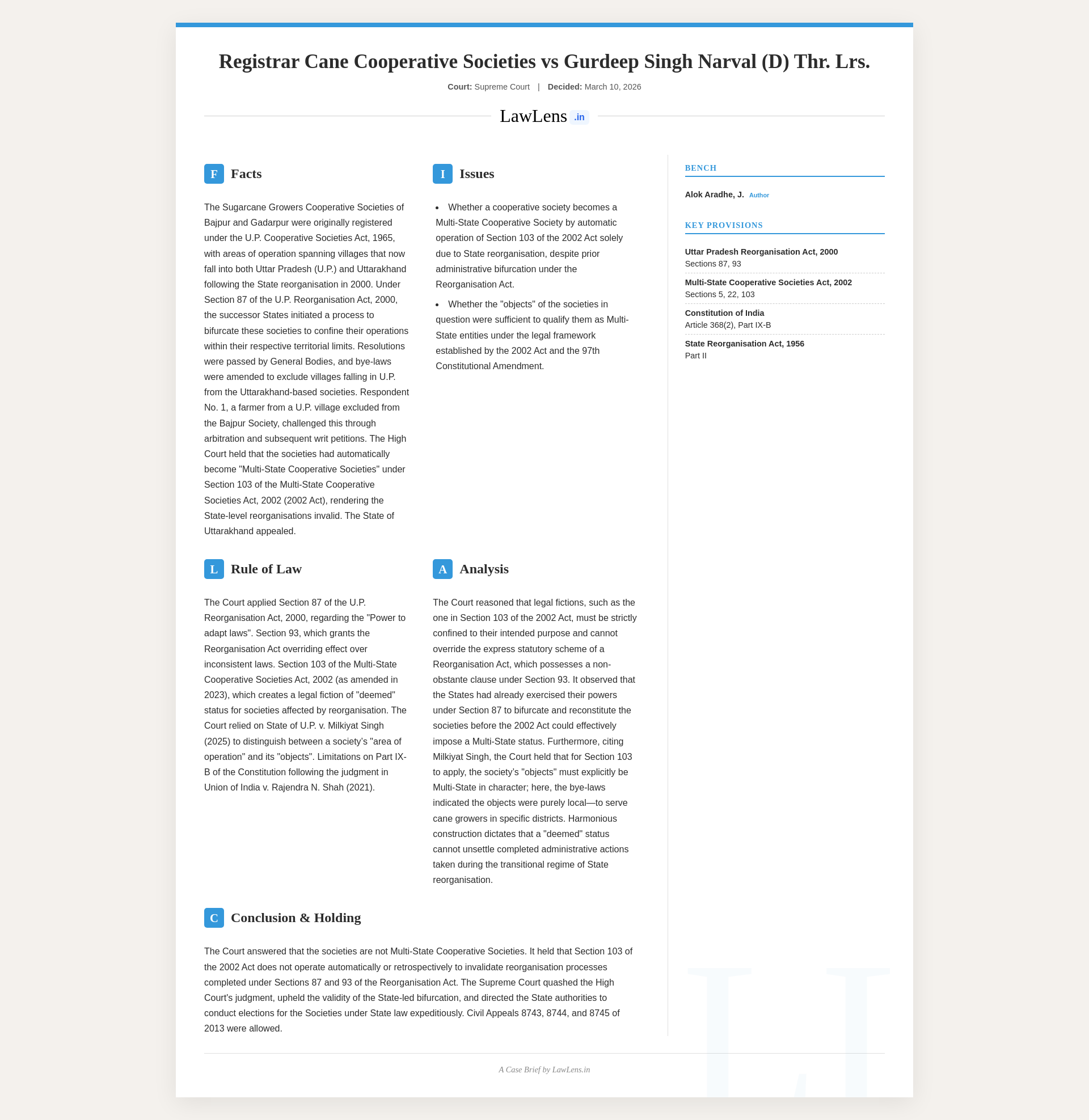 Registrar Cane Cooperative Societies & Ors. v. Gurdeep Singh Narval (D) through LRs. & Ors., 2026 INSC 216 - UP Reorganization Act- Multi-State Cooperative Societies Act