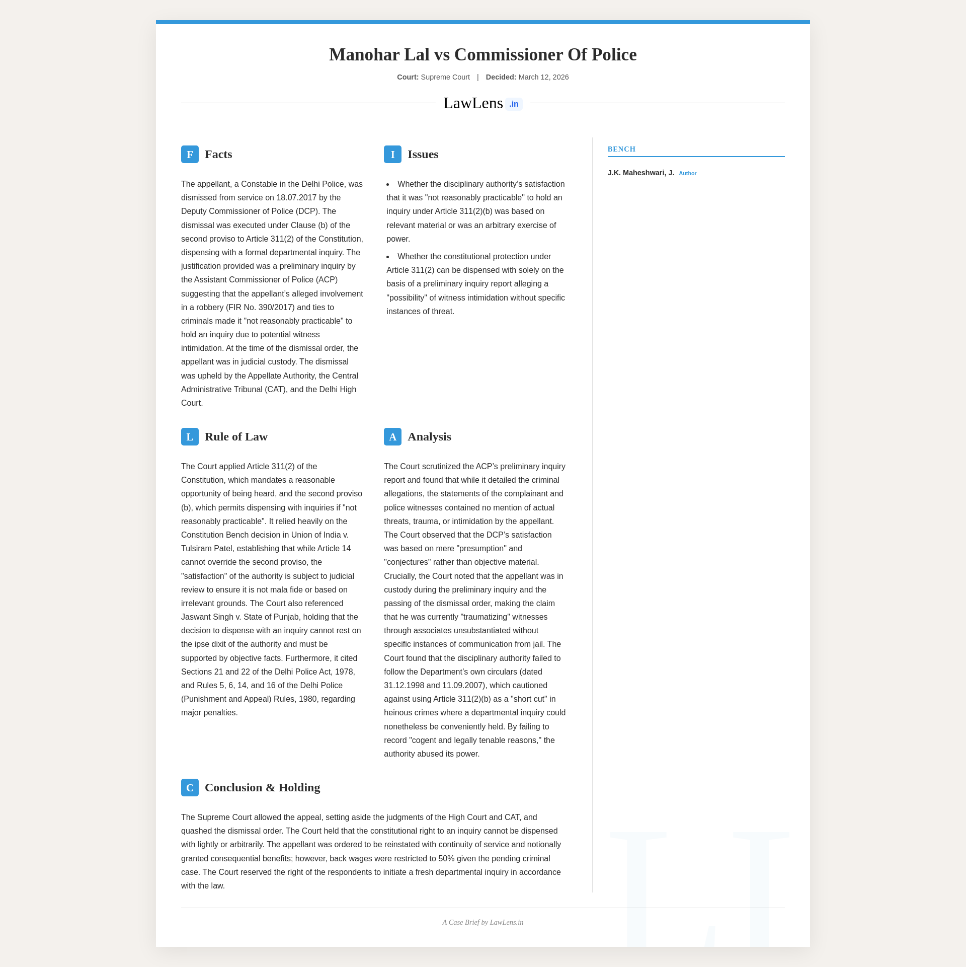 Manohar Lal v. Commissioner of Police 2026 INSC 234 - Article 311 Constitution