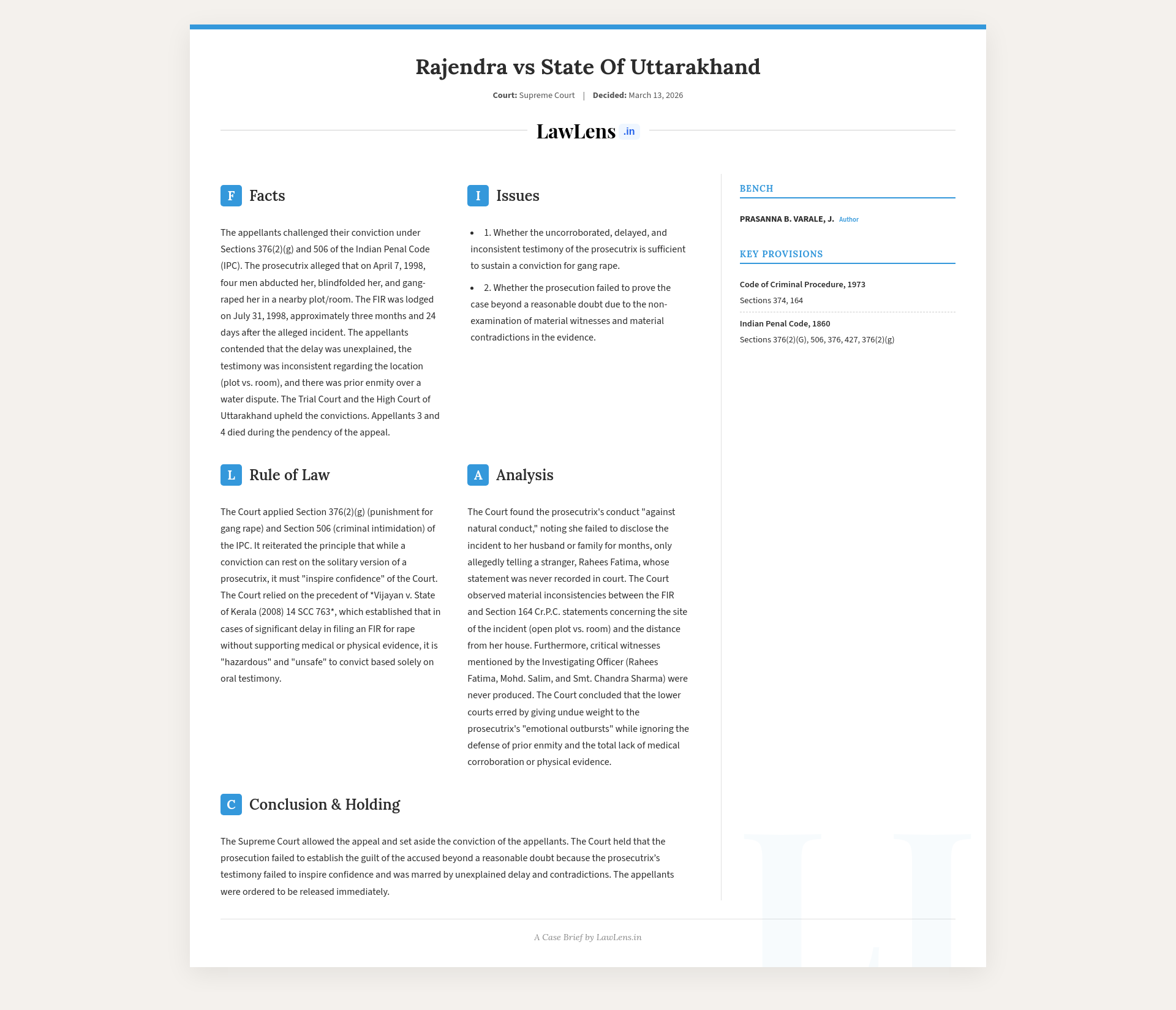 The appellants were convicted by the Trial Court under Section 376(2)(g) and Section 506 IPC for gang rape and criminal intimidation, and their conviction was affirmed by the Uttarakhand High Court. The Supreme Court, however, found that the prosecution failed to prove its case beyond reasonable doubt owing to a delay of nearly four months in lodging the FIR, absence of medical or corroborative evidence, non‑examination of key witnesses, prior enmity between the parties, and material inconsistencies in the prosecutrix’s versions. Relying on the principle in Vijayan v. State of Kerala that conviction based solely on the prosecutrix’s testimony is unsafe when it does not inspire confidence and suffers from serious infirmities, the Court allowed the appeal and set aside the conviction, directing the appellants’ release if not required in any other case.