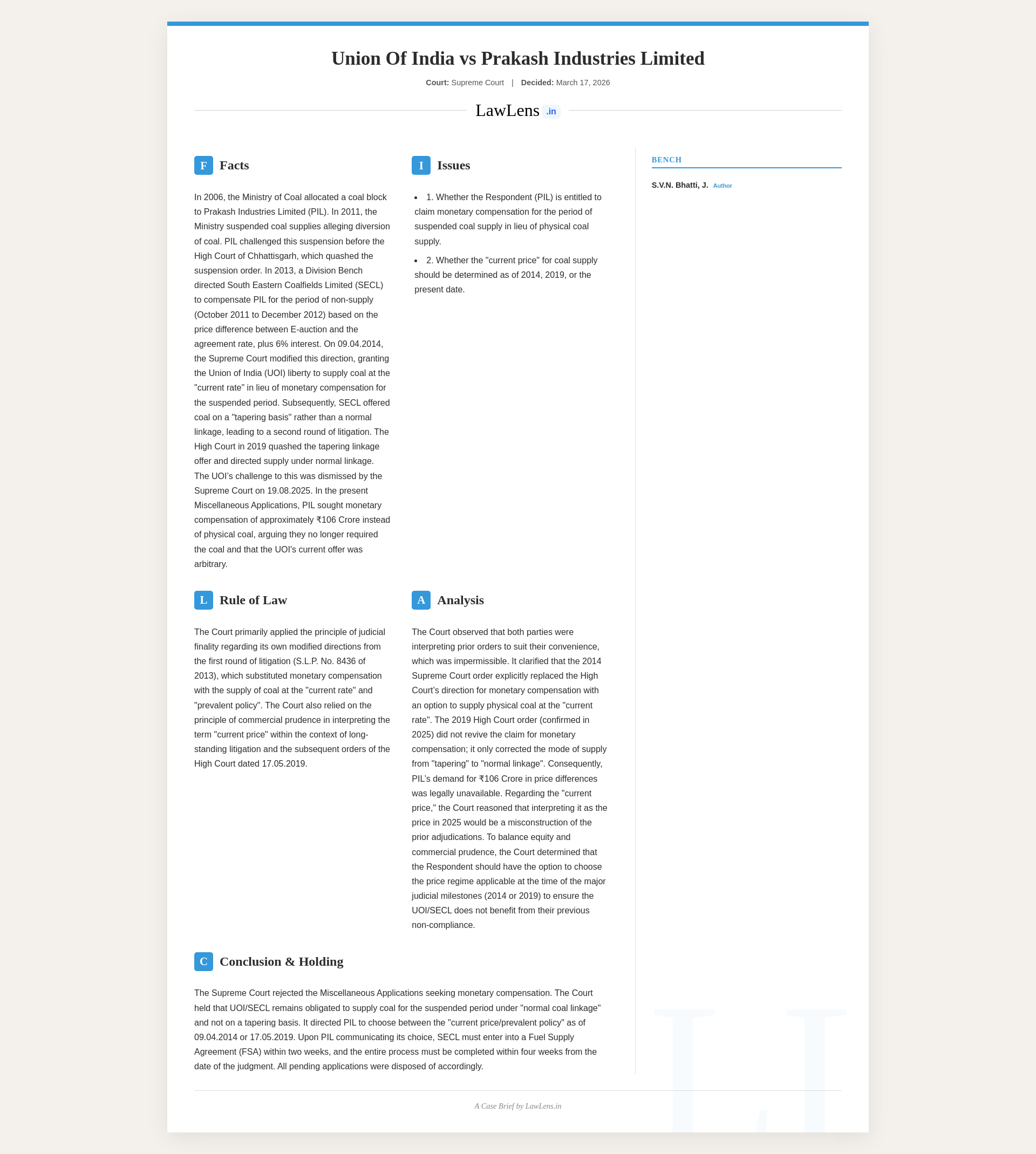 Union of India v. Prakash Industries Limited 2026 INSC 250 -Coal Supply