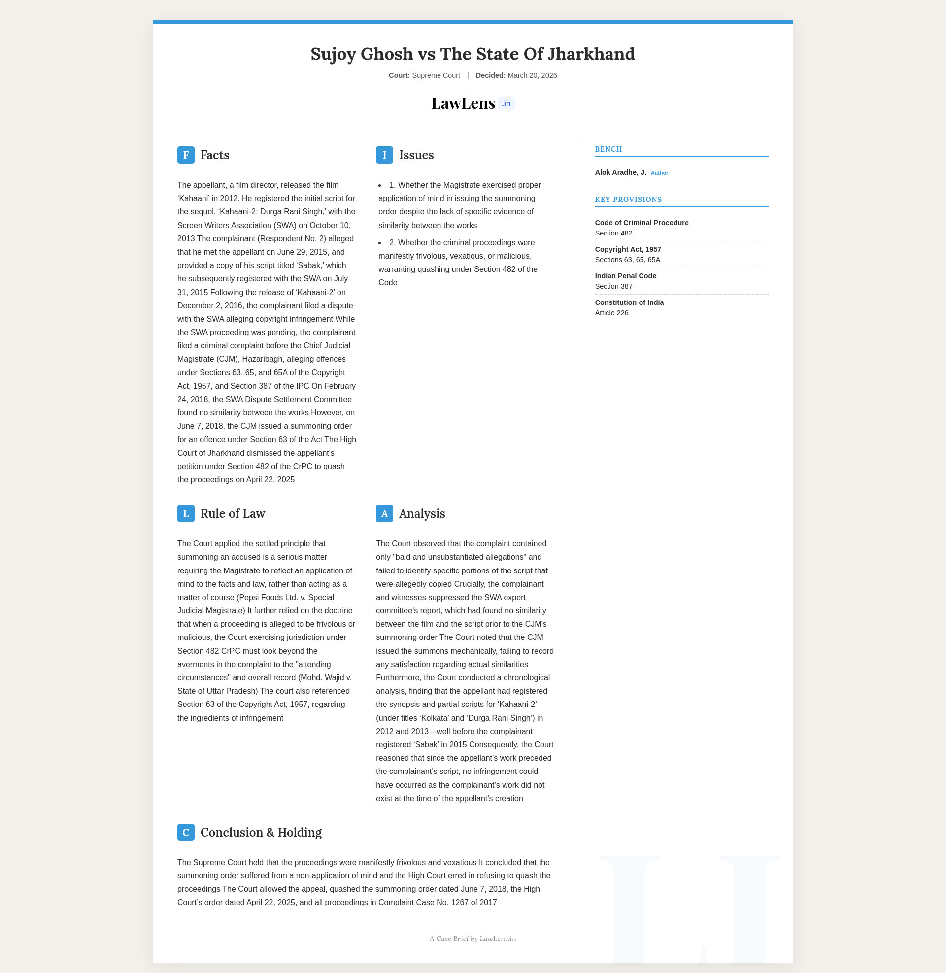 The appellant, film director Sujoy Ghosh, sought quashing of criminal proceedings alleging copyright infringement of the complainant’s script “Sabak” by his film “Kahaani‑2.” The Supreme Court held that the complaint and witness statements contained only bald, unsubstantiated allegations without identifying any similarity, that the expert Screen Writers Association committee had already found no similarity, and that the appellant’s script was registered well before the complainant’s work. Concluding that the summoning order showed non‑application of mind and that the proceedings were manifestly frivolous and vexatious, the Court quashed the summoning order, the High Court’s refusal to interfere, and the entire complaint.