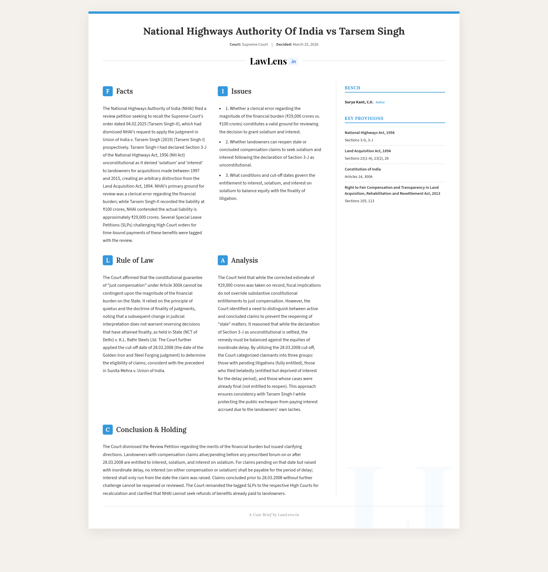 Case name: National Highways Authority of India v. Tarsem Singh and othersNeutral citation: 2026 INSC 291Coram: Surya Kant, CJI and Ujjal Bhuyan, J. (authored by Surya Kant, CJI)Judgment date: 25 March 2026 (New Delhi)