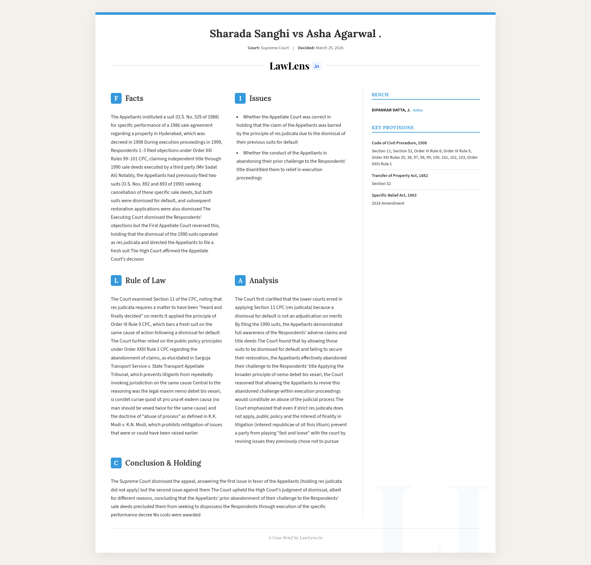 Sharada Sanghi v. Asha Agarwal 2026 INSC 292 - Dismissal For Default - Res Judicata