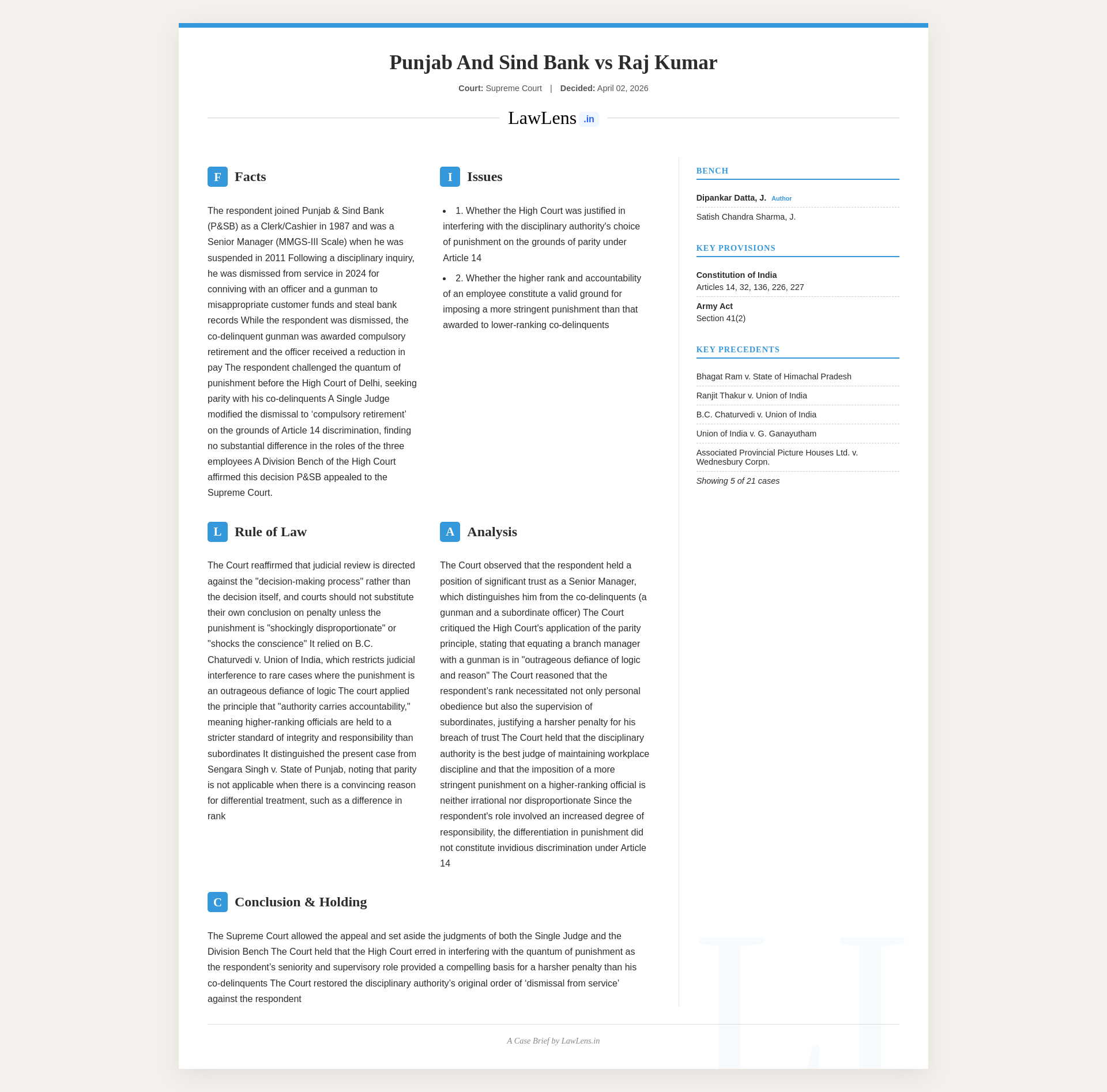 Case name: Punjab & Sind Bank v. Sh. Raj KumarNeutral citation: 2026 INSC 313Court: Supreme Court of India, Civil Appellate JurisdictionCase number: Civil Appeal No. 847 of 2026Coram: Justice Dipankar Datta and Justice Satish Chandra SharmaJudgment date: April 02, 2026 (New Delhi)