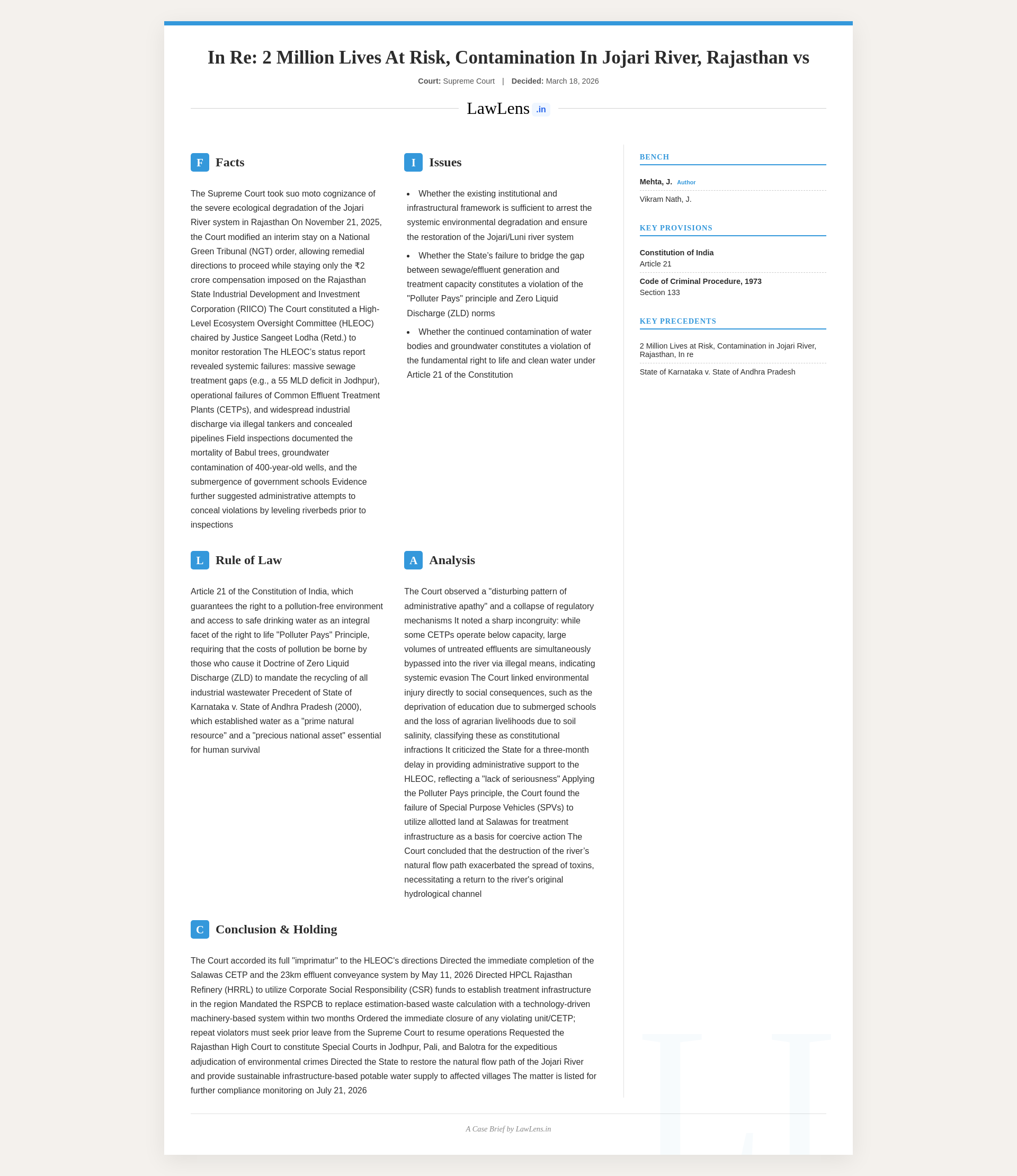 Constitution of India - Article 21 - The right to access clean drinking water is an integral facet of the right to life under Article 21 and cannot be compromised on account of administrative inaction or environmental neglect. The State is, therefore, under a constitutional obligation to take immediate and effective measures to restore contaminated water sources, prevent further pollution of groundwater, and make adequate and sustainable arrangements for the supply of potable water to the affected areas, so as to safeguard public health and uphold the fundamental rights of the residents.(Para 52) [Context: The Supreme Court, in a suo motu writ concerning massive pollution of the Jojari, Bandi and Luni river systems in Rajasthan, finds grave and continuing environmental degradation caused by sustained regulatory failure, illegal industrial discharges, and inadequate sewage treatment, severely impacting water, soil, public health, and livelihoods. It endorses and elevates the directions of a High‑Level Ecosystem Oversight Committee, and issues extensive interim directions for upgradation and strict operation of CETPs/STPs on Zero Liquid Discharge principles, sealing of all illegal discharge points, closure and prosecution of violating industries, restoration of the natural river course, strengthening of oversight bodies, and provision of safe drinking water. The Court also directs reconstitution of remediation committees, considers creation of an environmental restoration and compensation fund, calls for a Multi‑Disciplinary Expert Assessment Panel, and requests the Rajasthan High Court to establish Special Courts in Jodhpur, Pali and Balotra for speedy trial of environmental offences]