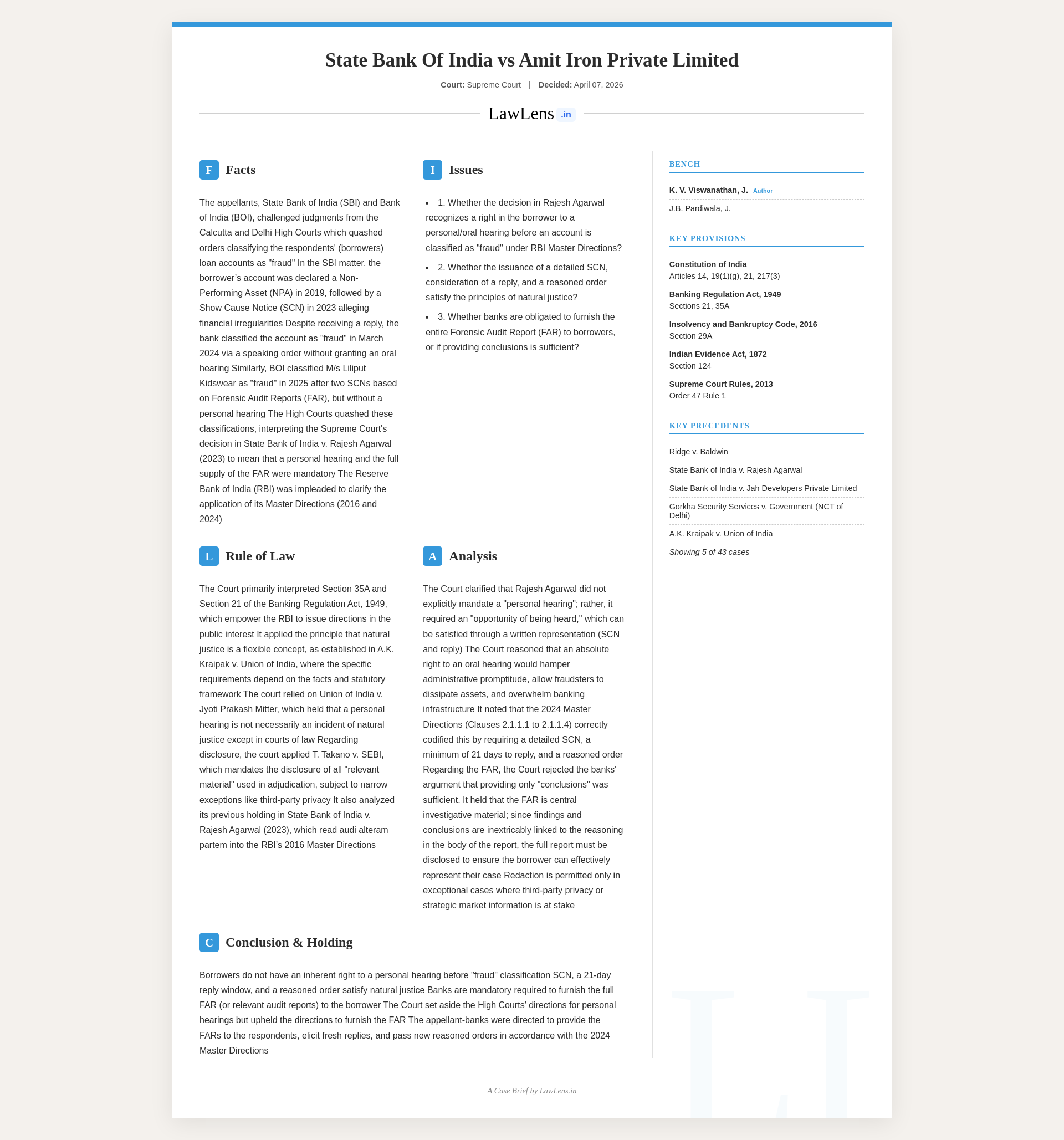 State Bank of India v. Amit Iron Private Limited 2026 INSC 323 - RBI Directions - Fraud Accounts Declaration - Personal Hearing Right