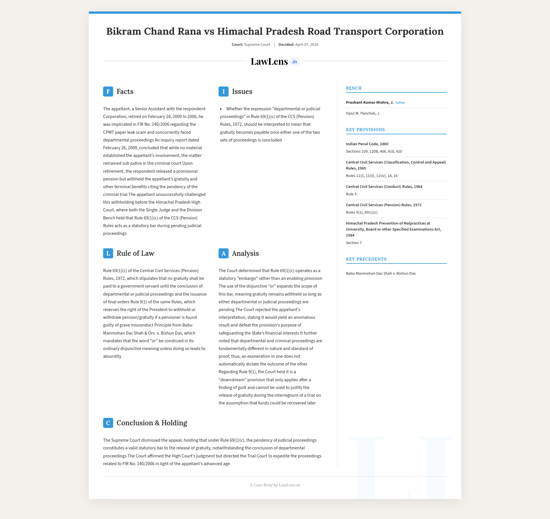 Central Civil Services (Classification, Control and Appeal) Rules, 1965 - Rule 69(1)(c) operates as an ‘embargo’ or a statutory bar, not as an enabling provision. The use of the ordinary disjunctive “or” expands the scope of this bar, indicating that gratuity shall not be paid so long as either departmental or judicial proceedings are pending.- The provision is downstream in its operation and cannot be invoked to justify the release of gratuity during the interregnum when proceedings are admittedly pending, on the premise that recovery could be effected at a later stage. (Para 15-16) [Context: The appellant, a retired Senior Assistant of the Himachal Pradesh Road Transport Corporation, challenged the withholding of his gratuity on the ground that he had been exonerated in departmental proceedings arising from the CPMT 2006 paper leak, though a connected criminal case (FIR No. 140/2006) was still pending. The Supreme Court interpreted Rule 69(1)(c) of the Central Civil Services (Pension) Rules, 1972 as an embargo provision, holding that no gratuity can be released while either departmental or judicial proceedings are pending, and rejected the contention that gratuity must be paid once one of the two sets of proceedings concludes. The Court also held that Rule 9(1) of the 1972 Rules operates only after guilt is established and cannot justify interim release of gratuity, and therefore dismissed the appeal while again directing the Trial Court to expedite the criminal trial.]