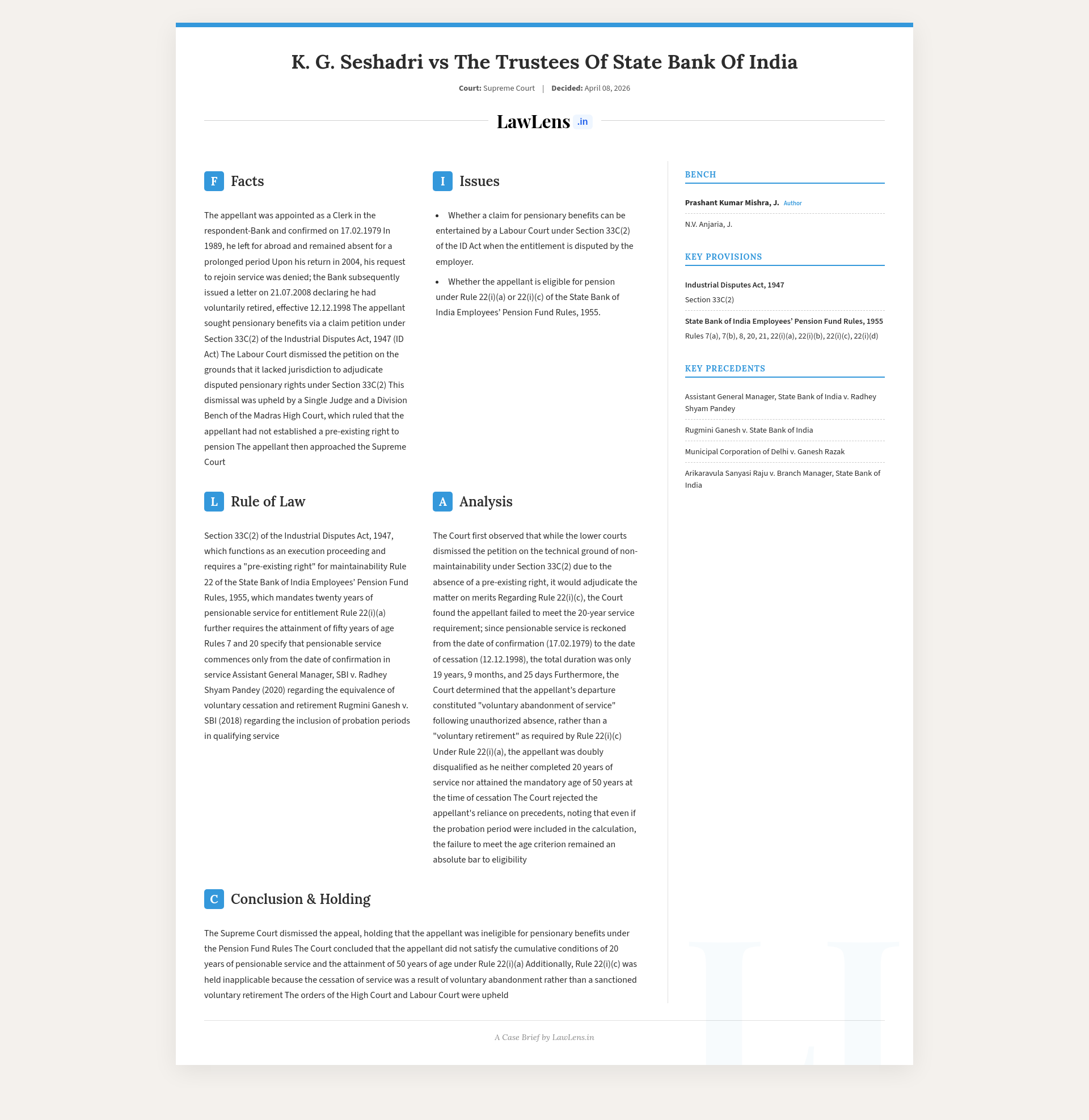 The Supreme Court considered whether K.G. Seshadri, a clerk of SBI whose services were treated as voluntarily abandoned from 12.12.1998, was entitled to pension under the SBI Employees’ Pension Fund Rules. Interpreting Rules 7, 20 and 22, the Court held that his pensionable service fell short of 20 years and that he had also not attained the requisite age of 50 years, so he did not qualify under Rule 22(i)(a), nor could he invoke Rule 22(i)(c) because his case was one of voluntary abandonment, not voluntary retirement under a VRS. Proceeding on merits despite earlier dismissals on the technical ground of non‑maintainability under Section 33C(2) of the ID Act, the Court ultimately dismissed the appeal, holding that no pensionary right had accrued.