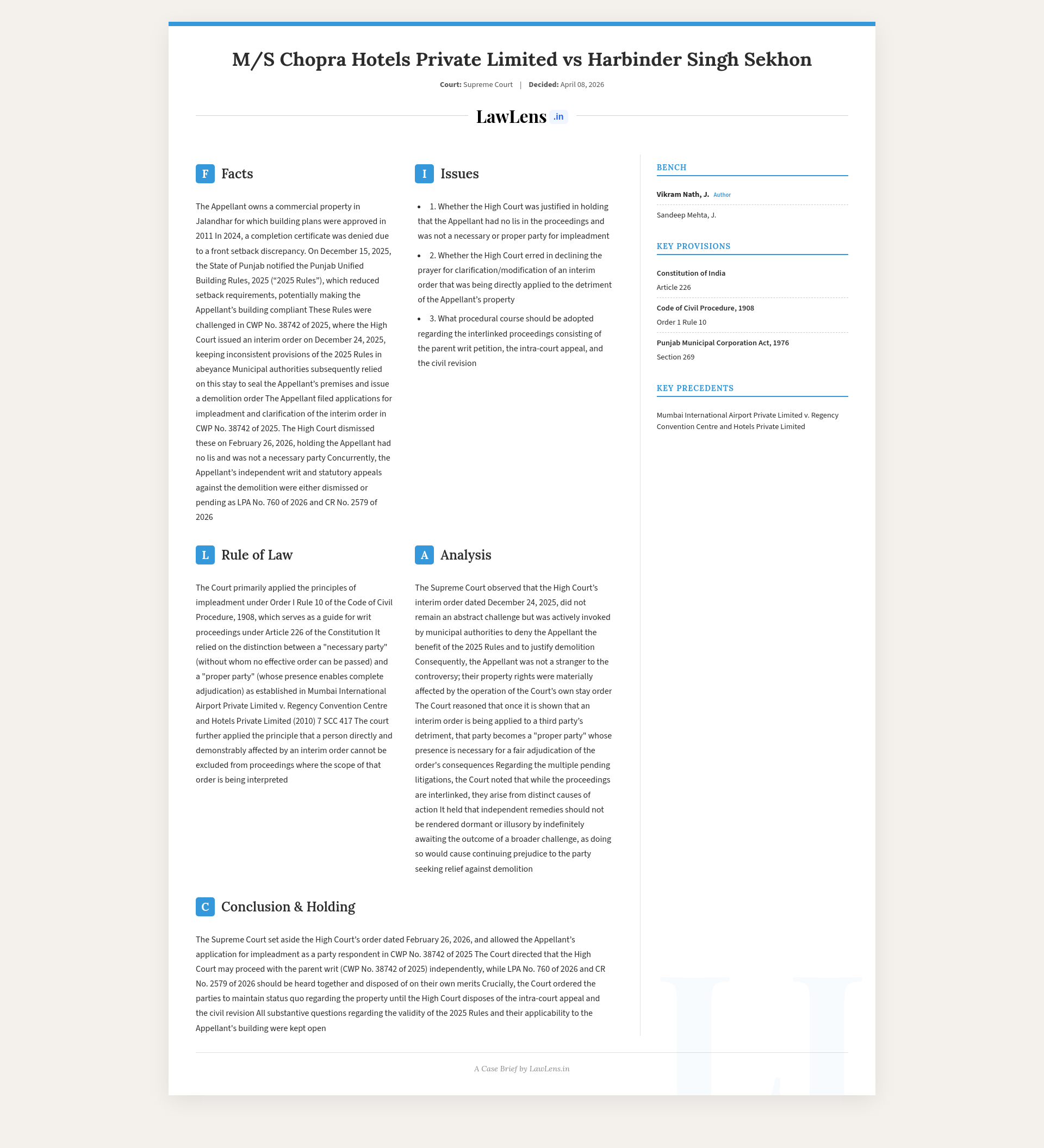 The Supreme Court held that M/s Chopra Hotels Pvt. Ltd., though not an original party to the writ challenging the Punjab Unified Building Rules, 2025, was directly and demonstrably affected by the High Court’s interim order dated 24.12.2025 which had been used by authorities and a Single Judge to deny it the benefit of the 2025 Rules. Consequently, the Court set aside the High Court’s order dated 26.02.2026, allowed the hotel’s impleadment in CWP No. 38742 of 2025, directed that the main writ, LPA No. 760 of 2026 and CR No. 2579 of 2026 be heard in a coordinated but independent manner, and ordered maintenance of status quo regarding the property until the LPA and revision are decided. At the same time, the Court declined to decide the substantive validity or applicability of the 2025 Rules, expressly leaving all merits questions open for the High Court.