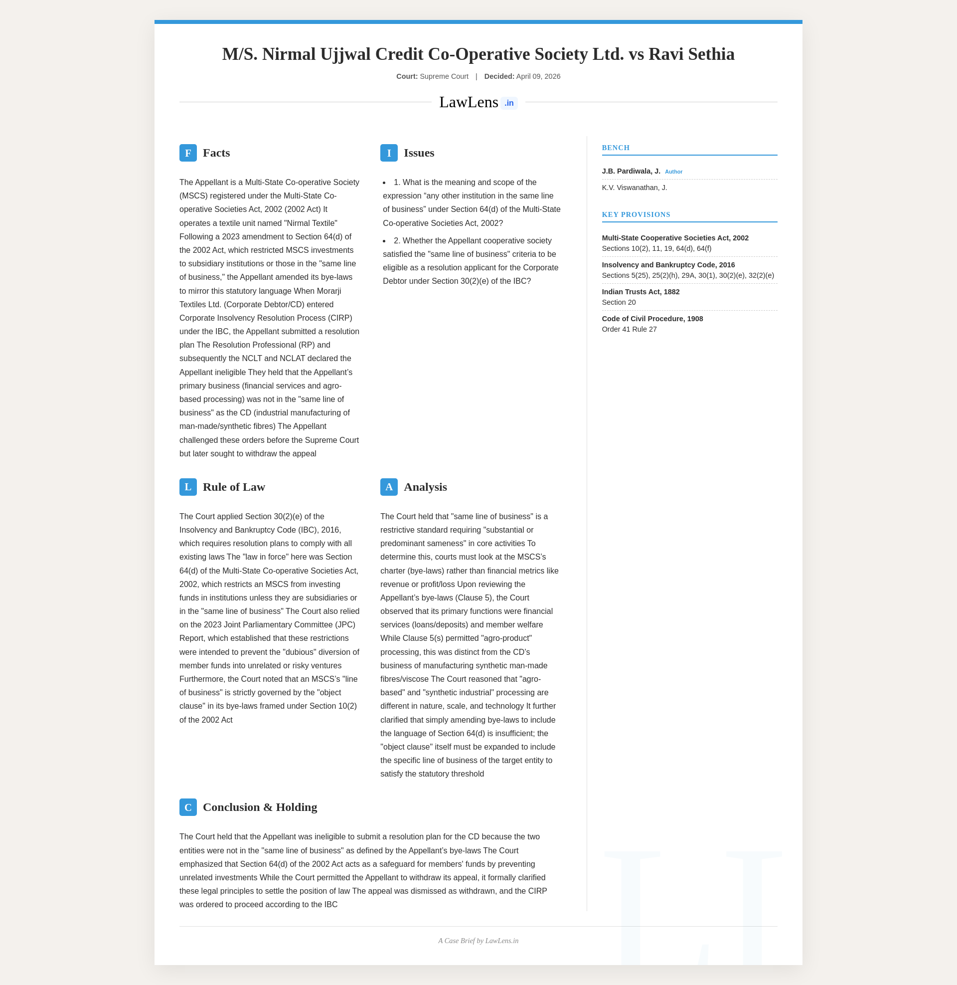 Case name and neutral citation:M/s Nirmal Ujjwal Credit Co‑operative Society Ltd. v. Ravi Sethia & Ors., 2026 INSC 338.