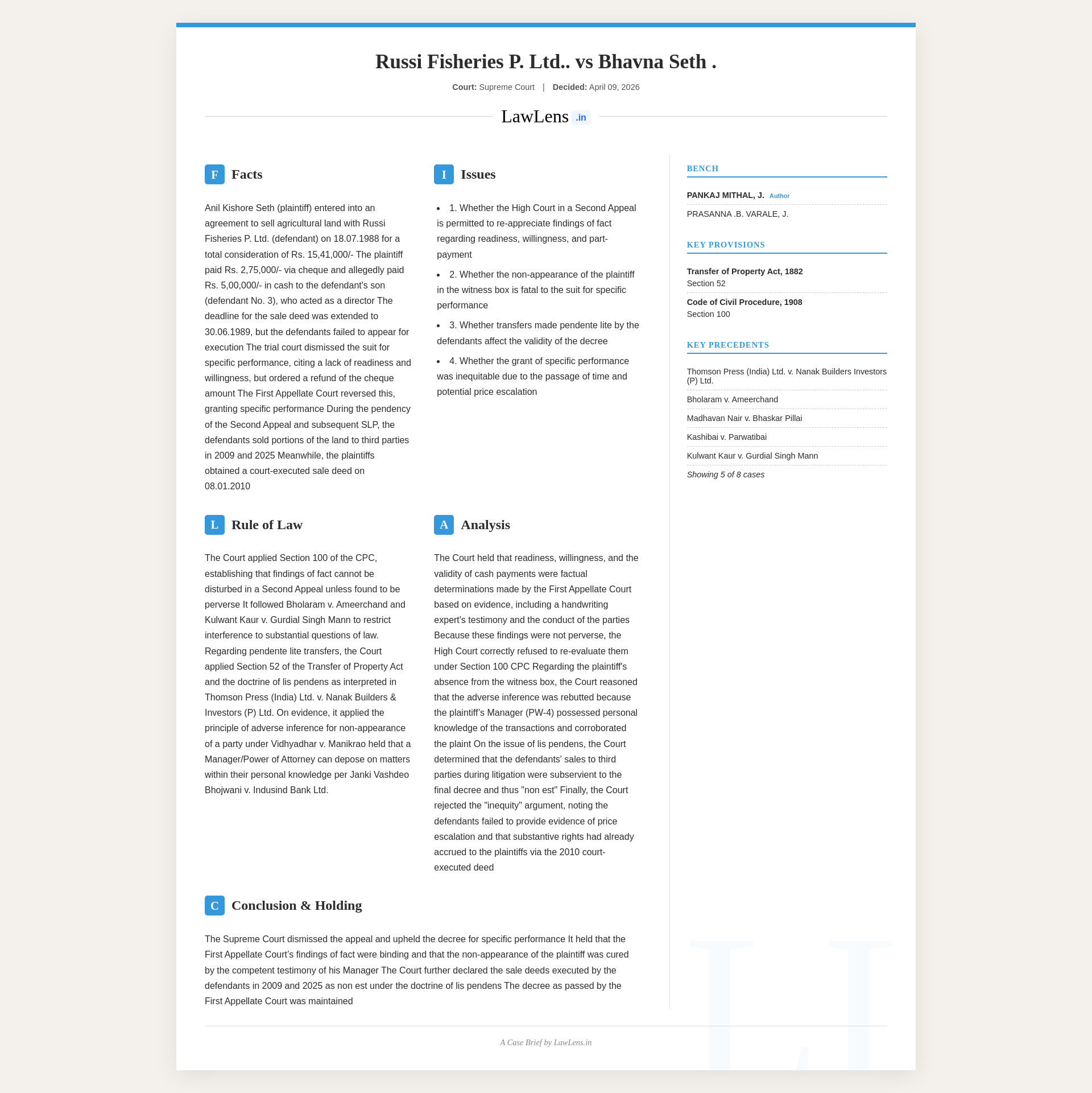 Case name: Russi Fisheries P. Ltd. & Anr. v. Bhavna Seth & Ors.Neutral citation: 2026 INSC 339Court & jurisdiction: Supreme Court of India, Civil Appellate Jurisdiction, Civil Appeal No. 109 of 2010Coram: Hon’ble Mr. Justice Pankaj Mithal, Hon’ble Mr. Justice Prasanna B. VaraleJudgment date: 09 April 2026 (New Delhi)
