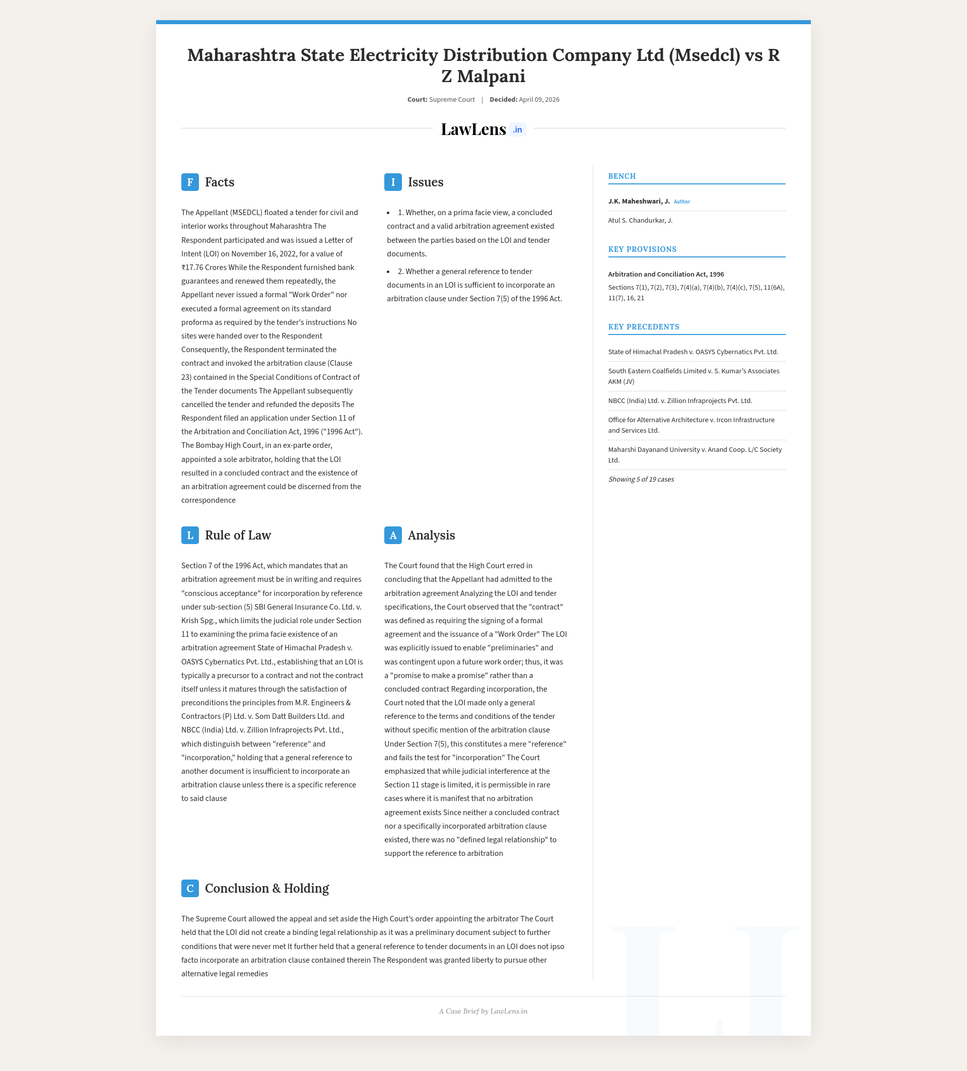 Maharashtra State Electricity Distribution Company Limited (MSEDCL) v. R Z Malpani, 2026 INSC 342 - Arbitration Agreement - Letter of Intent