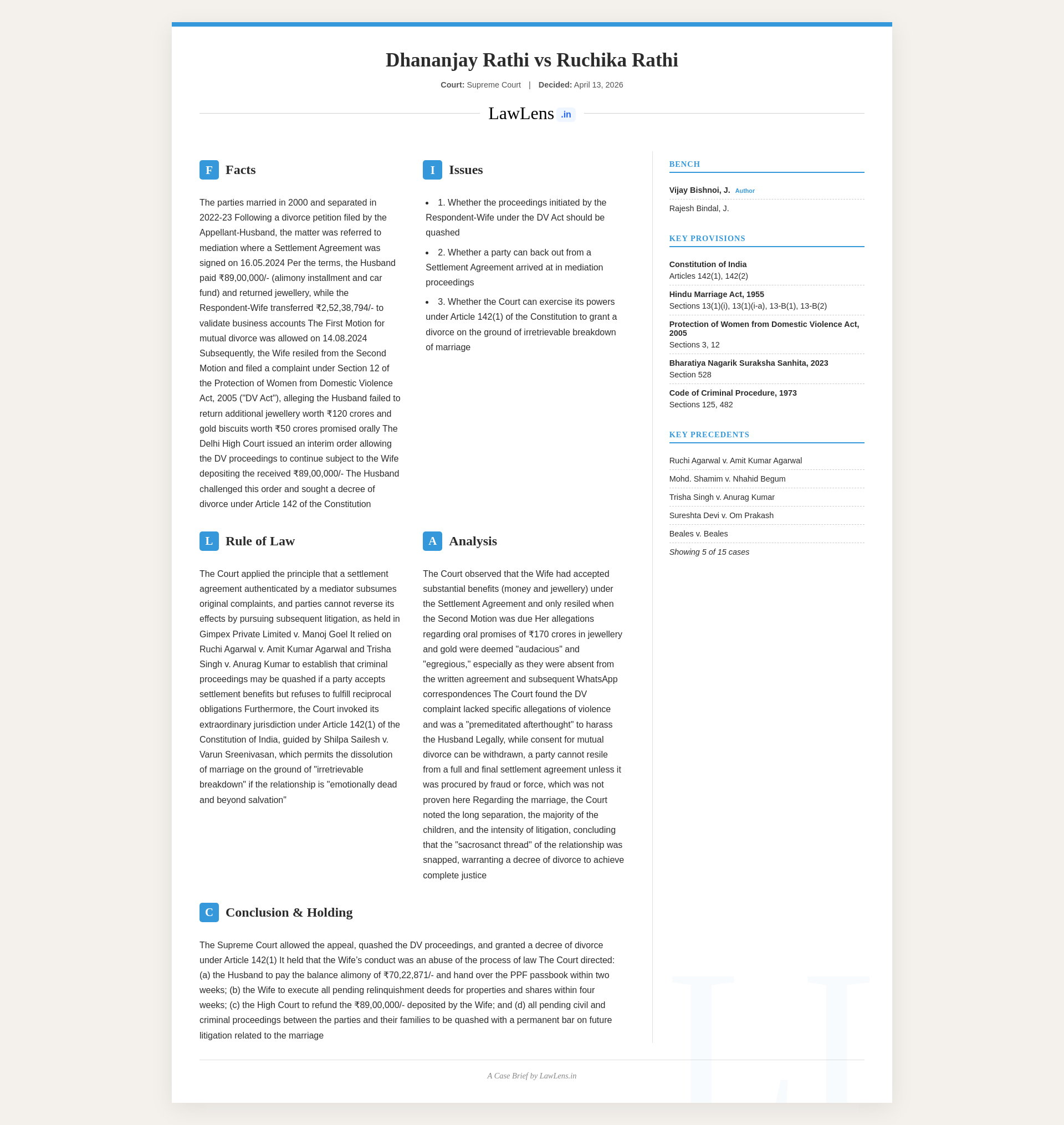 Dhananjay Rathi v. Ruchika Rathi, 2026 INSC 360 - Matrimonial - Settlement - Resiling
