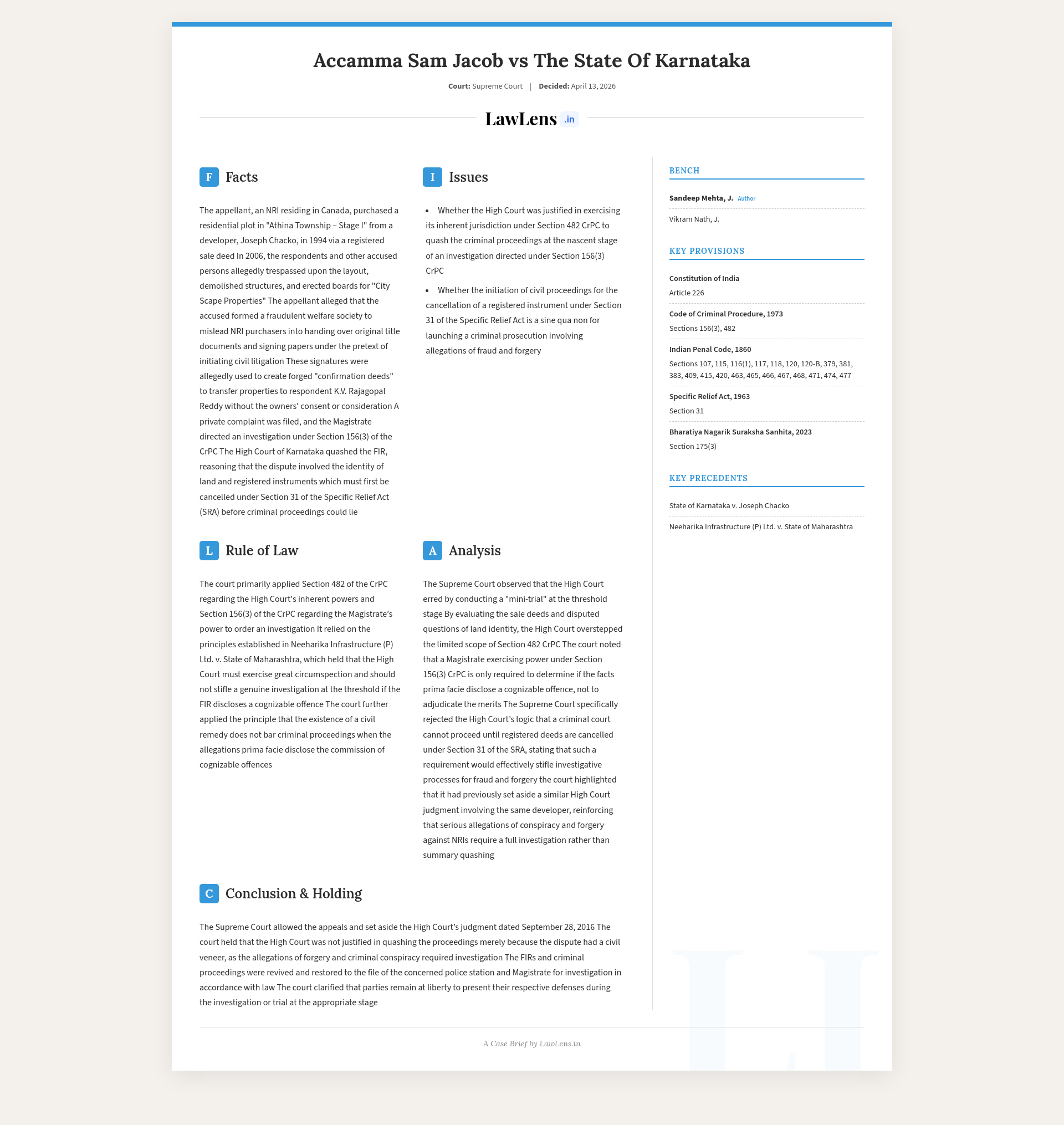 This case concerns complaints by an NRI plot purchaser and similarly placed buyers alleging a large‑scale conspiracy involving forged GPAs, fraudulent confirmation deeds, and subsequent sale transactions over land in Survey No. 12, Doddagubbi Village, Bengaluru, to deprive them of their properties. The Karnataka High Court had quashed the FIRs and proceedings under Section 482 CrPC, treating the matter as purely civil and insisting that the registered sale deeds first be cancelled under Section 31 of the Specific Relief Act before criminal law could be set in motion. The Supreme Court holds that the High Court exceeded its jurisdiction at a nascent Section 156(3) stage, reaffirms the Neeharika Infrastructure principle that genuine criminal investigations should not be stifled on civil‑dispute grounds, sets aside the High Court’s order, and restores the FIRs and proceedings to be investigated and tried in accordance with law.