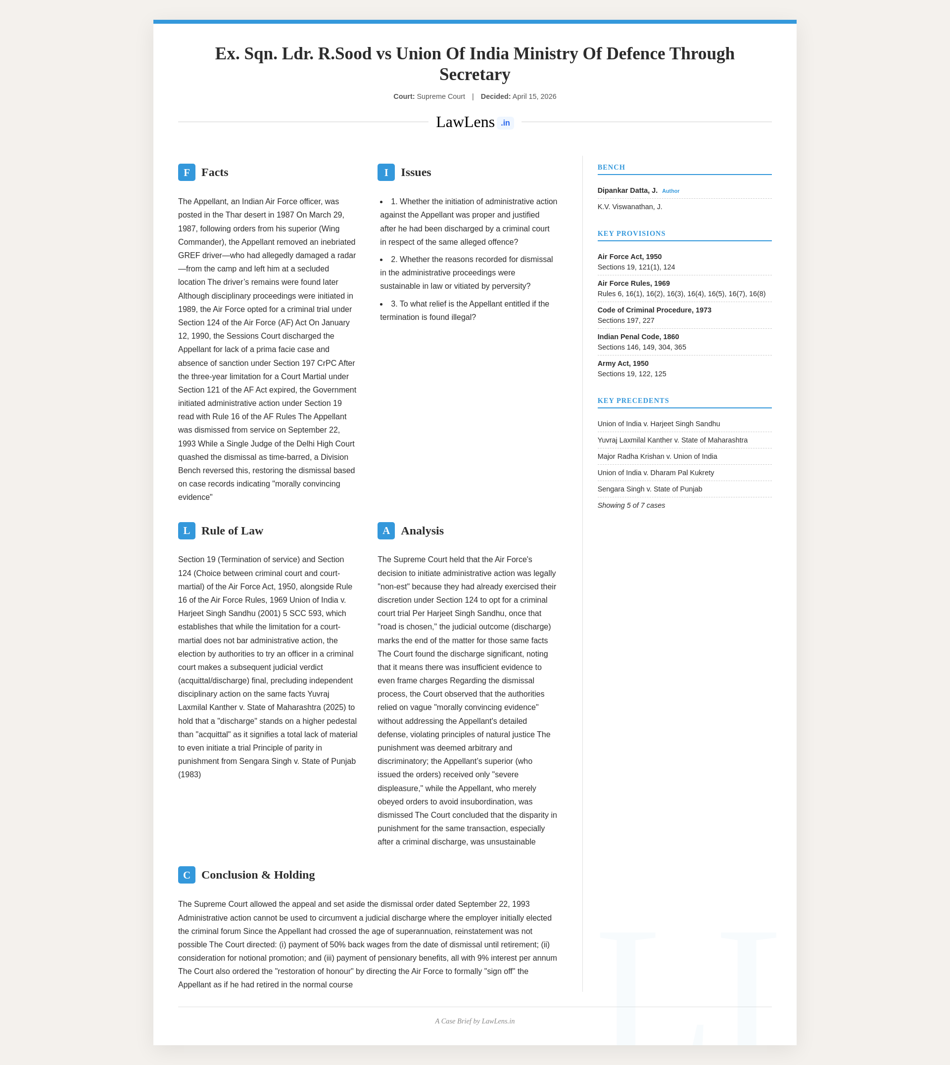 Ex. Sqn. Ldr. R. Sood v. Union of India 2026 INSC 366 -Disciplinary Proceedings - Criminal Trial - Discharge