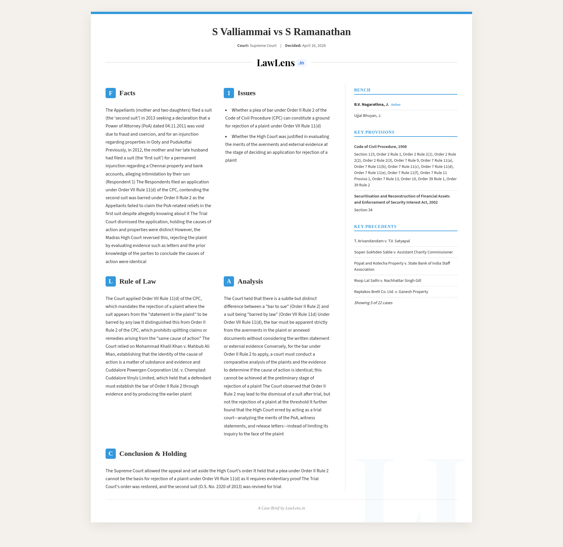 Case name: S. Valliammai & Others v. S. Ramanathan & AnotherNeutral citation: 2026 INSC 372