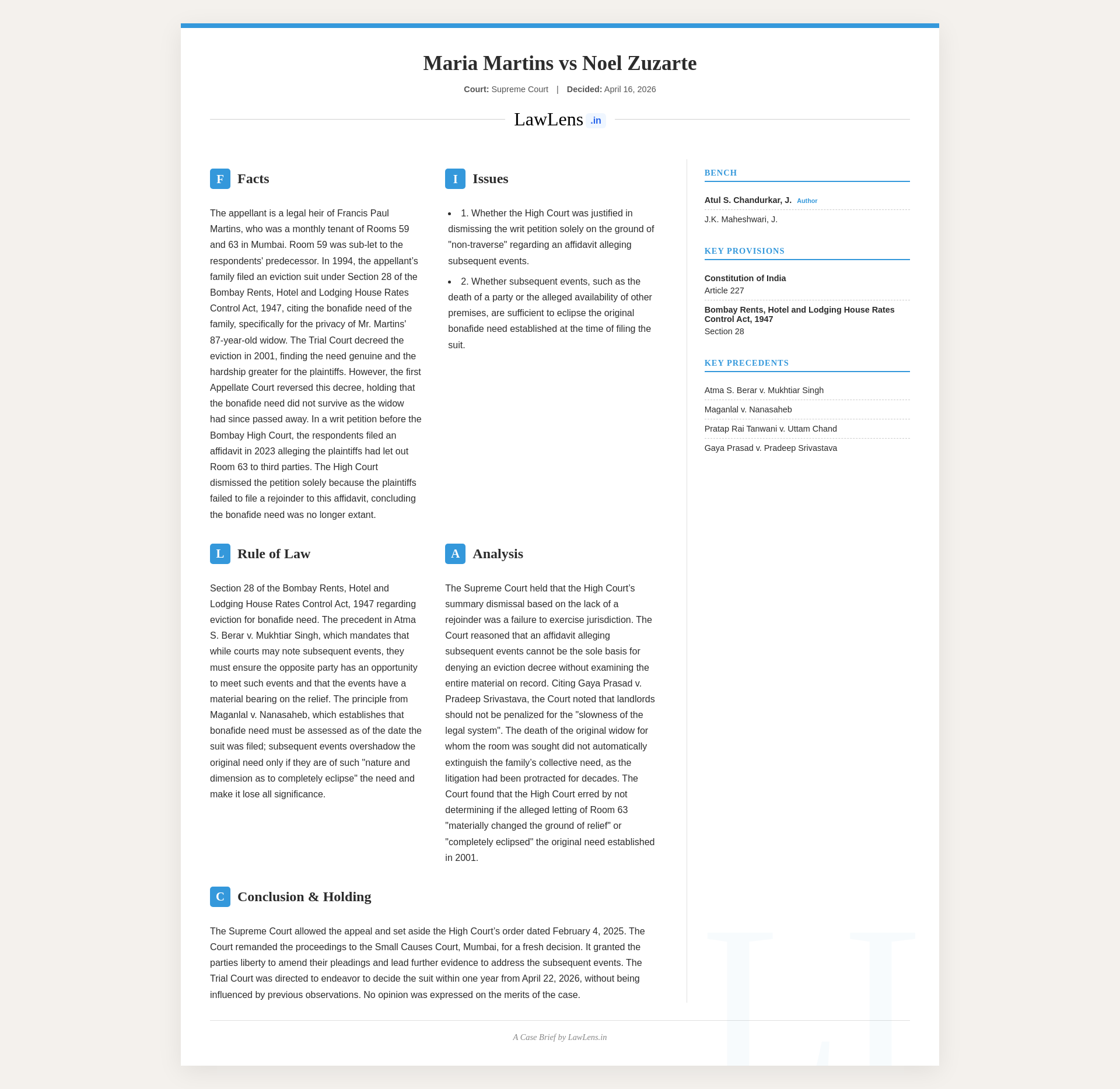 Maria Martins v. Noel Zuzarte 2026 INSC 376 - Tenancy - Bonafide Need - Subsequent Events
