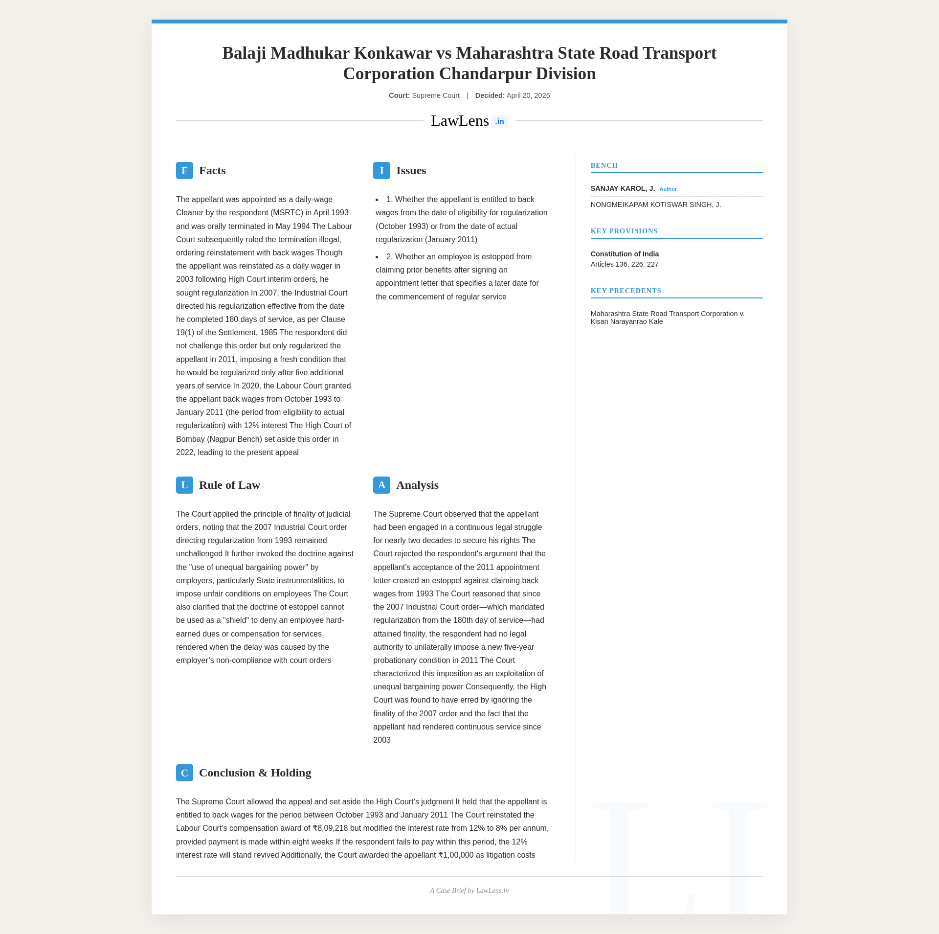 Case name and neutral citation:Balaji Madhukar Konkanwar v. Maharashtra State Road Transport Corporation, 2026 INSC 392