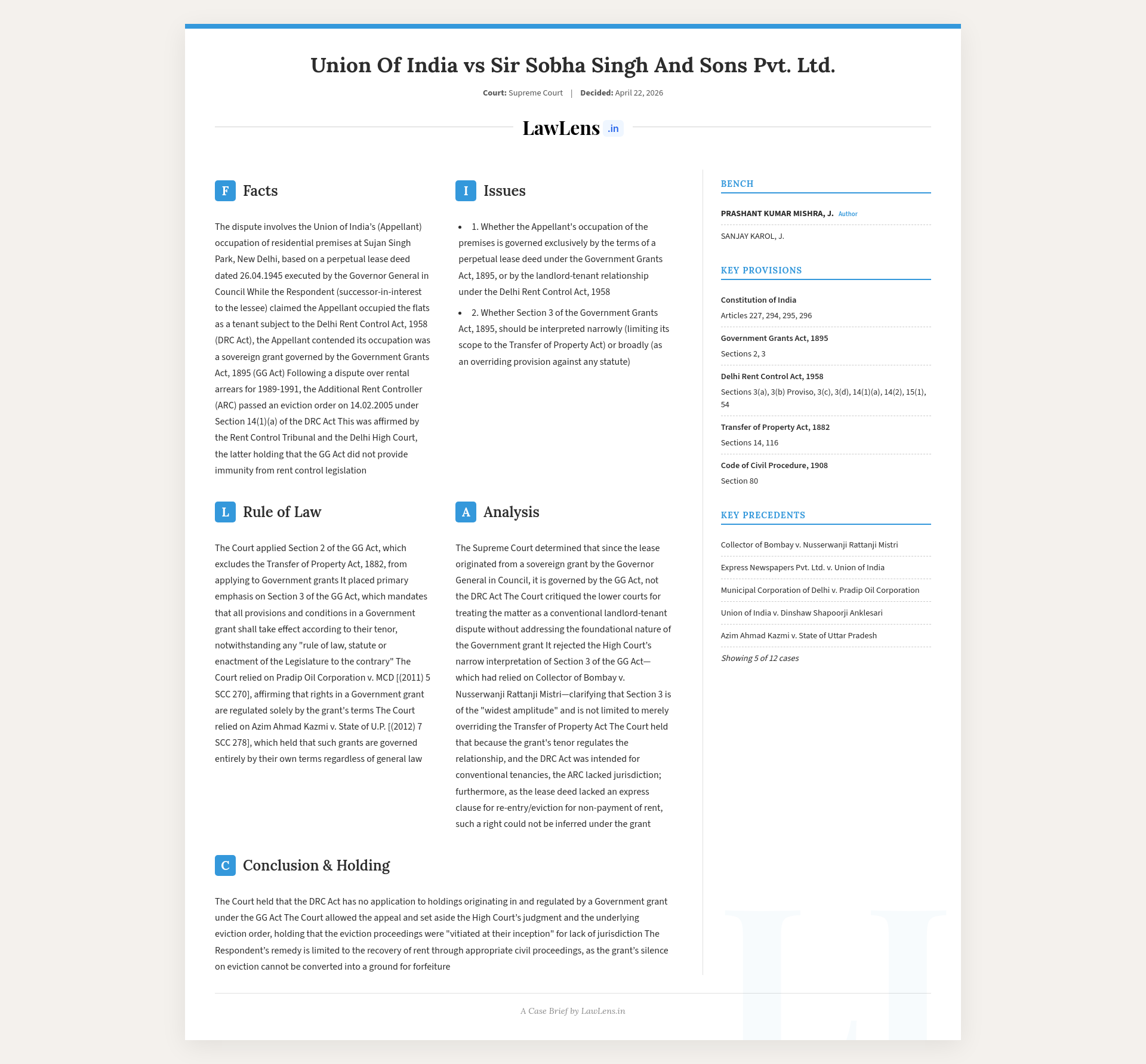 The Supreme Court held that the Union of India’s occupation of residential premises at Sujan Singh Park flowed from a Government grant and a perpetual lease, so the relationship was governed exclusively by the tenor of that grant under Section 3 of the Government Grants Act, 1895, and not by the Delhi Rent Control Act, 1958. Consequently, the eviction proceedings under Section 14(1)(a) DRC Act were without jurisdiction and stood vitiated, and the High Court’s judgment affirming those proceedings was set aside, allowing the appeal. The Court clarified that while the respondent cannot seek eviction under the DRC Act, it remains free to pursue appropriate civil remedies for recovery of rent or other reliefs strictly in accordance with the terms of the grant and general civil law.