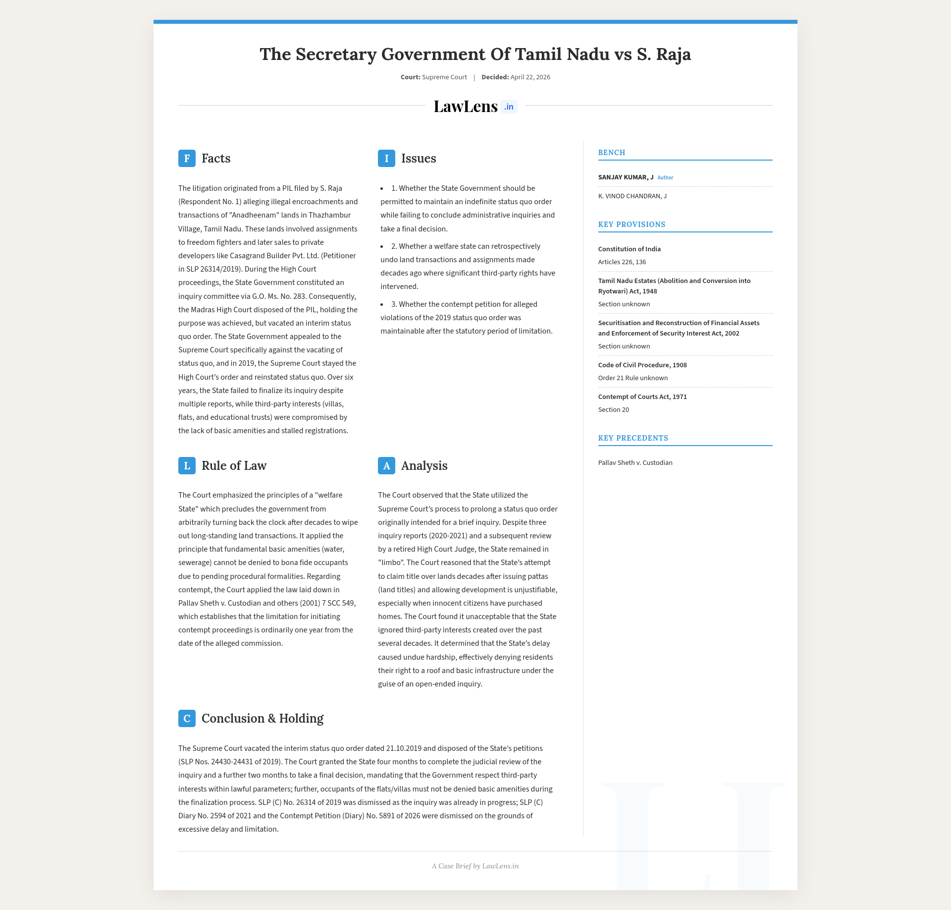 The Supreme Court dealt with special leave petitions arising from a Madras High Court order concerning alleged illegal land transactions in Thazhambur Village, where long‑standing pattas and large‑scale third‑party housing developments had come up over several decades. The Court noted that the State of Tamil Nadu had repeatedly failed to complete its enquiry within the timelines it itself set, had used the Supreme Court’s 2019 status quo order to indefinitely freeze the situation, and could not now “turn back the clock” to wipe out decades‑old transactions to the detriment of innocent purchasers. It therefore vacated the status quo, disposed of the State’s SLPs, dismissed Casagrand’s SLP and a delayed SLP by another party, and also dismissed a belated contempt petition as time‑barred in light of the one‑year limitation principle recognized in Pallav Sheth.