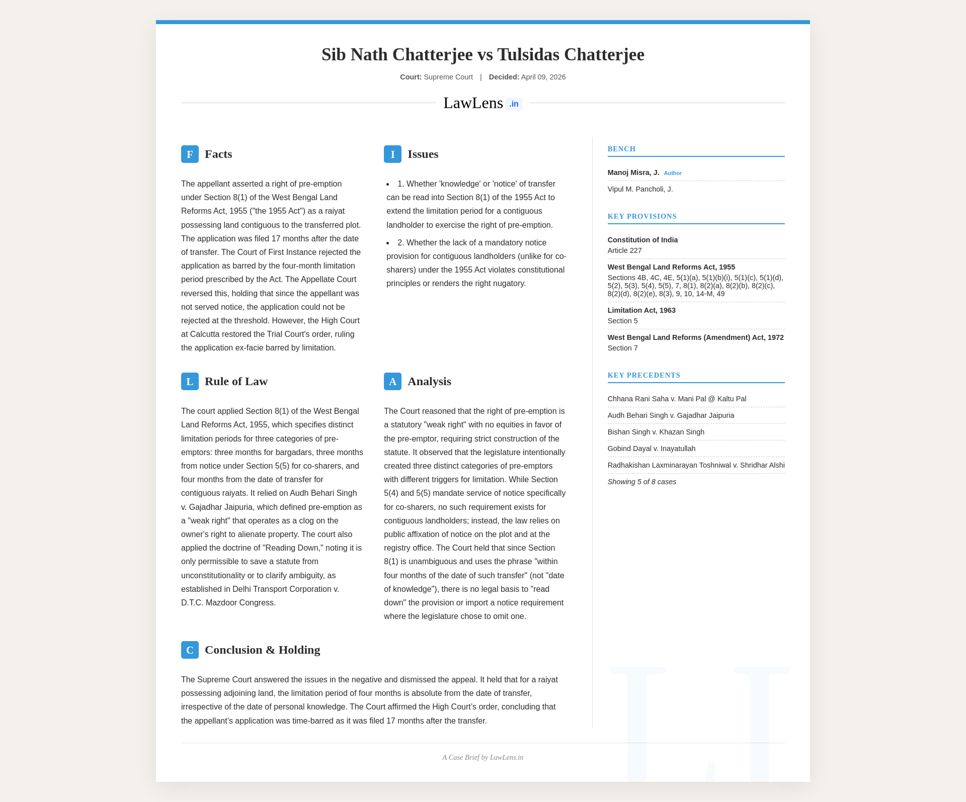 Sib Nath Chatterjee v. Tulsidas Chatterjee 2026 INSC 409 -West Bengal Land Reforms Act - Doctrine Of Reading Down