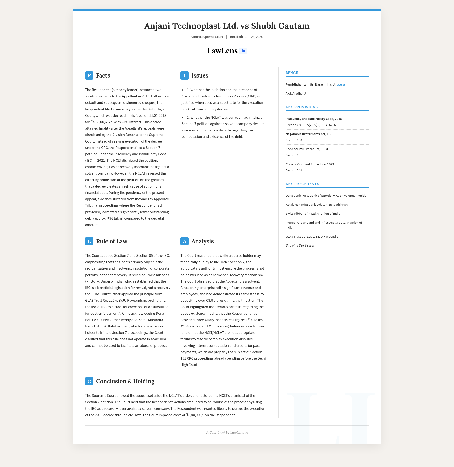 Case name: Anjani Technoplast Ltd. v. Shubh GautamNeutral citation: 2026 INSC 410Coram:Justice Pamidighantam Sri NarasimhaJustice Alok AradheJudgment date: April 23, 2026Court: Supreme Court of India, Civil Appellate Jurisdiction, Civil Appeal No. 8247 of 2022