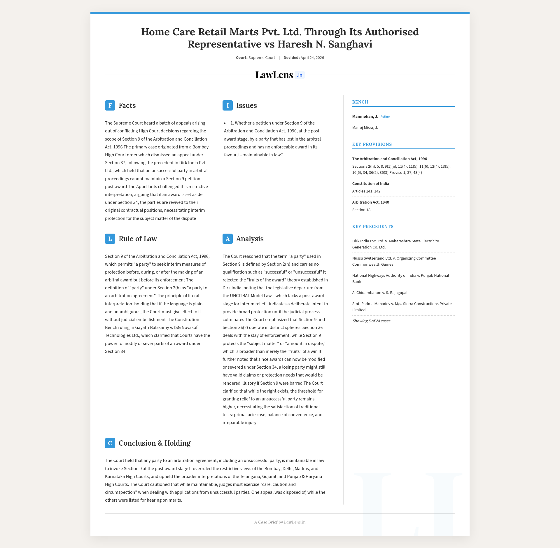 The Supreme Court resolves a conflict among High Courts by holding that any party to an arbitration agreement, including an unsuccessful party in arbitration, may maintain a Section 9 petition for interim measures at the post‑award stage, up to enforcement under Section 36. It reasons that the statutory expression “a party” in Section 9 is clear and cannot be judicially cut down to “successful party”, that Sections 34, 36 and 9 operate in distinct spheres, and that denying Section 9 relief to a losing party would leave it remediless even where the award is stayed or vulnerable. At the same time, the Court stresses that while such Section 9 relief is legally maintainable, the threshold for grant to an unsuccessful party is higher and courts must exercise care, caution and circumspection in such cases.
