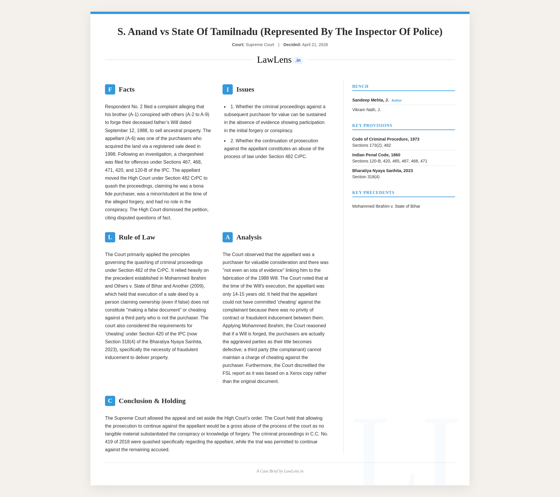 Case name and neutral citation:S. Anand v. State of Tamil Nadu (Represented by the Inspector of Police) & Anr., 2026 INSC 418