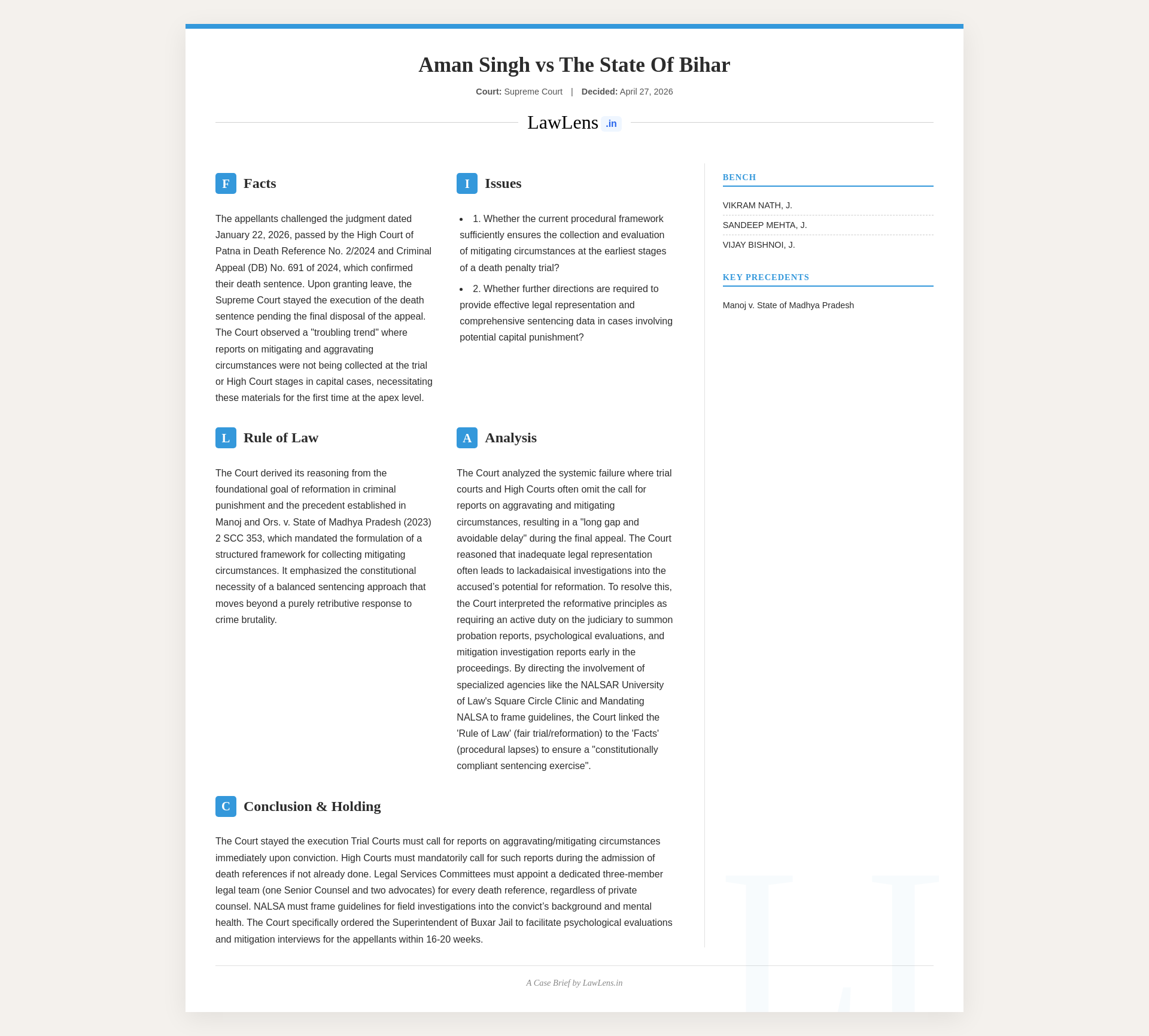 Aman Singh vs. State of Bihar 2026 INSC 424 - Death Sentence Matters - Calling Of Report -Aggravating & Mitigating Circumstances