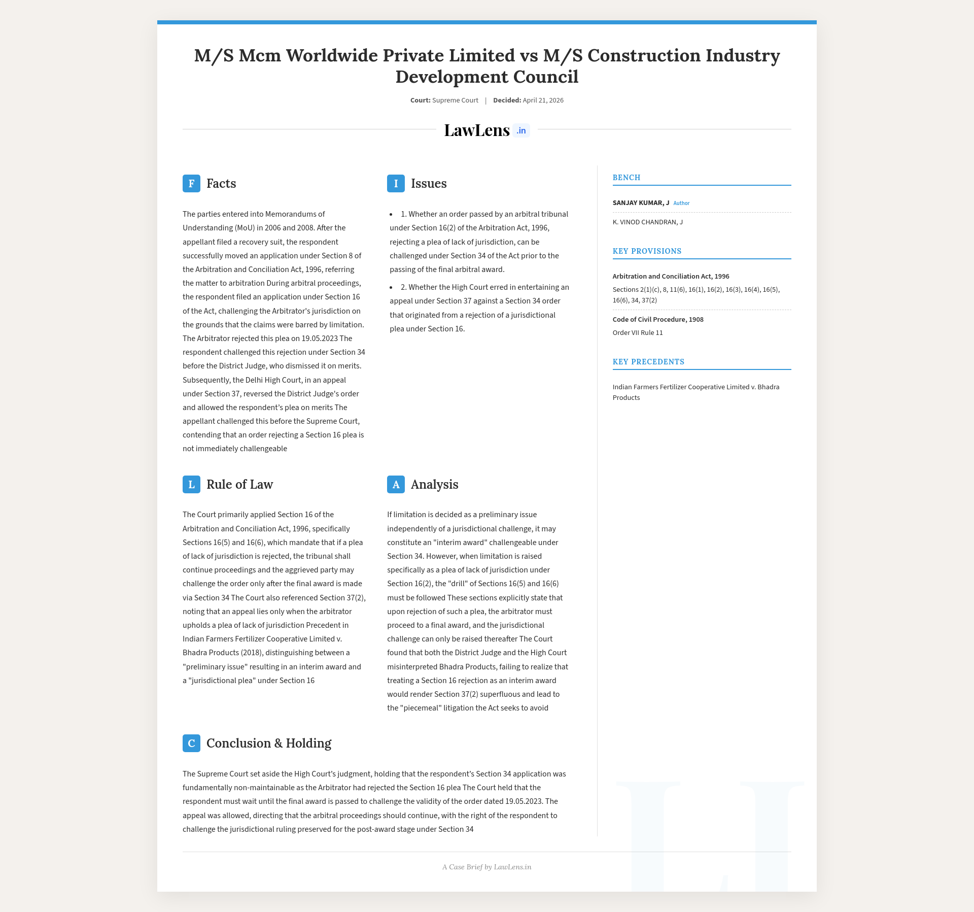 The Supreme Court held that an order of an arbitral tribunal rejecting a jurisdictional objection under Section 16(2) of the Arbitration and Conciliation Act, 1996 cannot be challenged immediately under Section 34, but may only be assailed after the final award. Clarifying its earlier decision in Indian Farmers Fertilizer Cooperative Ltd v. Bhadra Products, the Court explained that only a determination of an issue like limitation treated as a standalone “interim award” (not under Section 16) is directly challengeable under Section 34, whereas a rejection of a Section 16 plea must follow the “drill” of Sections 16(5) and (6). Consequently, the Court set aside the Delhi High Court’s judgment entertaining an appeal under Section 37 against such a Section 34 order, and held that the respondent may question the Section 16 rejection only in a post-award Section 34 challenge.