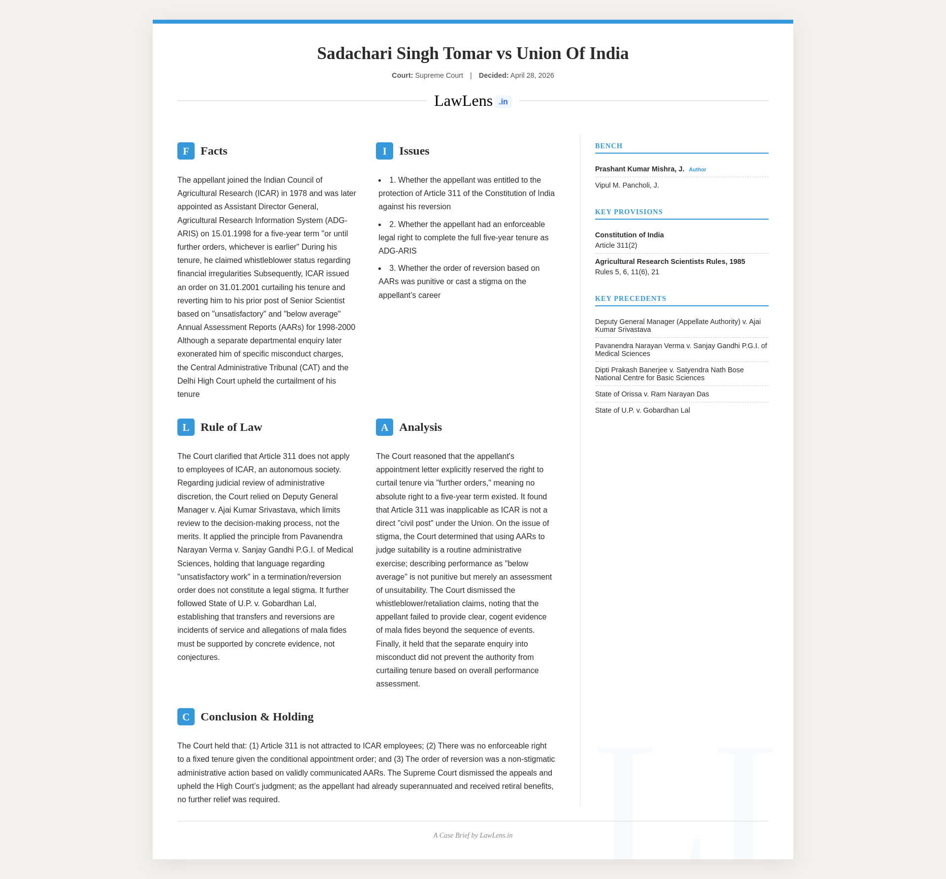 - Constitution of India – Article 311 (particularly Article 311(2); held inapplicable because ICAR is an autonomous society and not a civil post under Union/State).