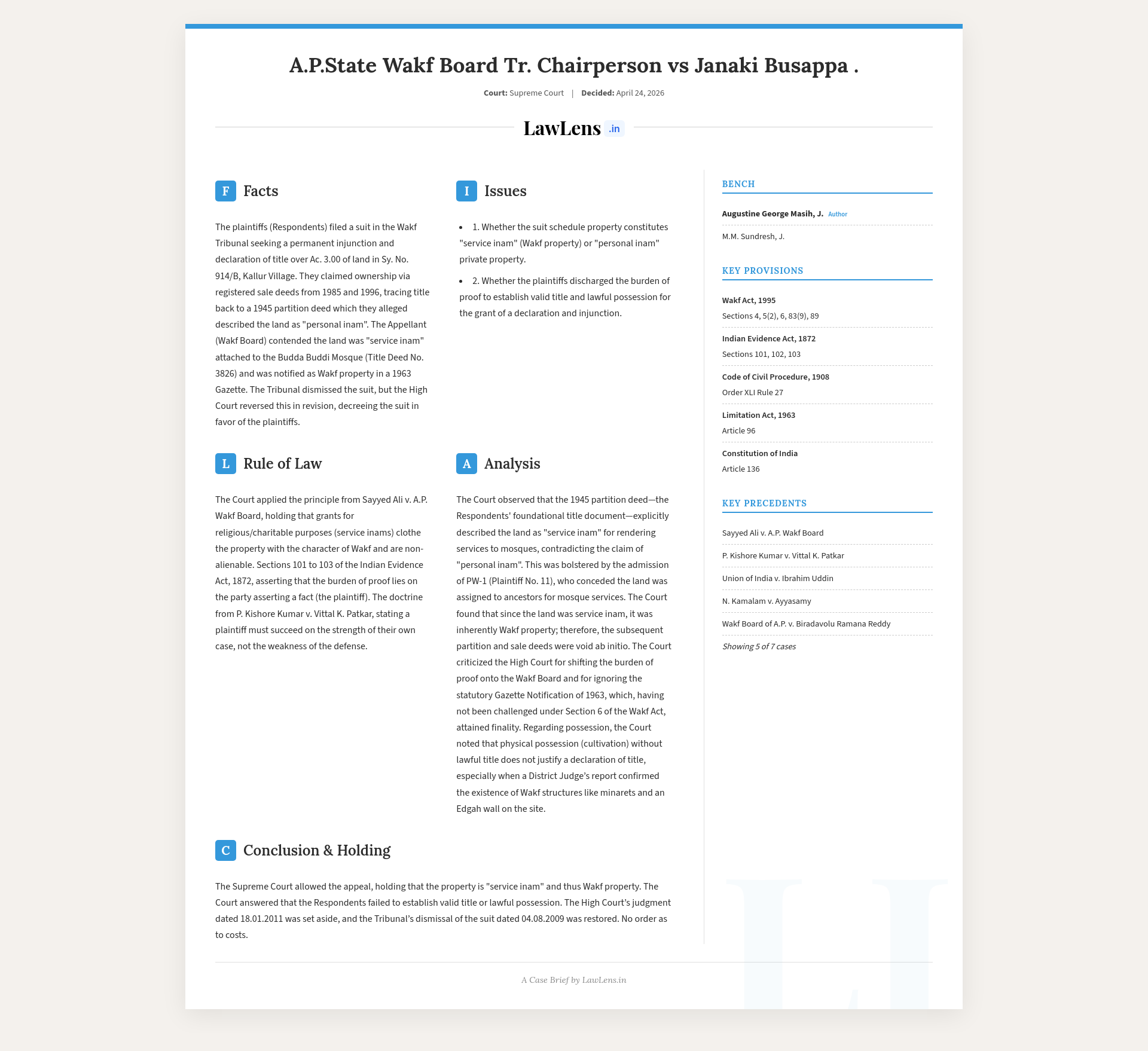 The Supreme Court held that the suit land in Sy. No. 914/B at Kallur is “service inam” attached to Budda Buddi Mosque and Asthabal Masjid, and therefore partakes the character of Wakf property, making the partition deed of 01.06.1945 and subsequent sale deeds in favour of the plaintiffs void and incapable of conferring title. Emphasising that a plaintiff must succeed on the strength of their own title and that service inam grants for religious purposes are inherently Wakf, the Court found that the plaintiffs neither proved valid title nor lawful possession, and that the High Court had wrongly shifted the burden of proof onto the Wakf Board while re‑appreciating evidence in revision. Consequently, the Supreme Court set aside the Andhra Pradesh High Court’s order dated 18.01.2011 and restored the Wakf Tribunal’s judgment and decree dated 04.08.2009 dismissing the suit.